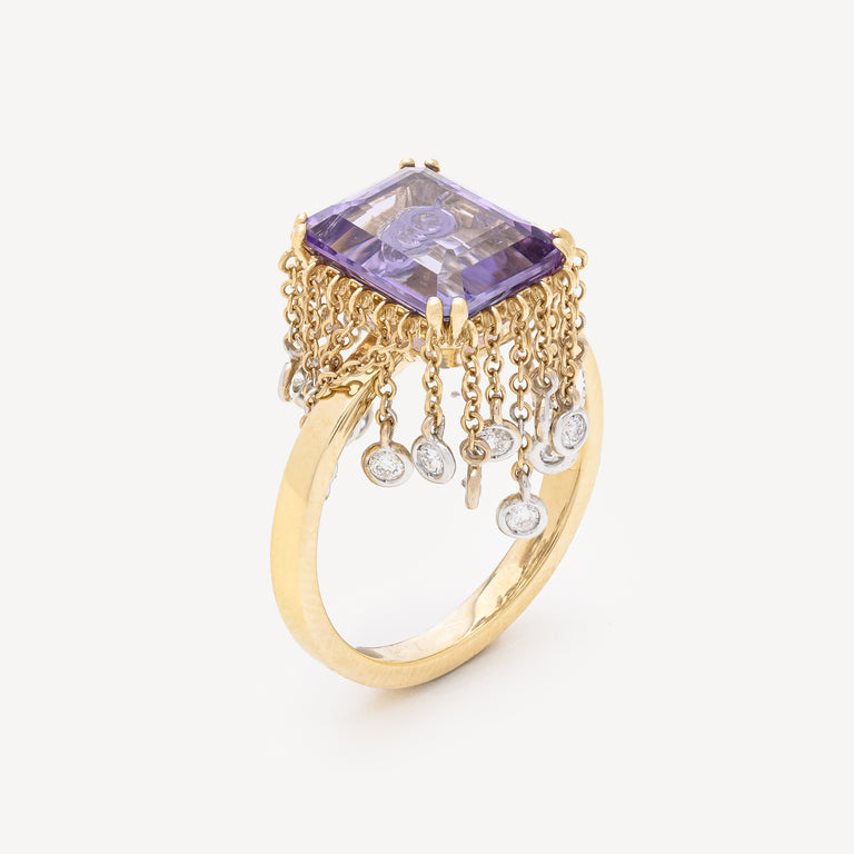 This Lisa O. ring is an exclusive creation in 18-carat gold, featuring a design as refined as it is eclectic. Sparkling diamonds gravitate around a sublime amethyst center stone.