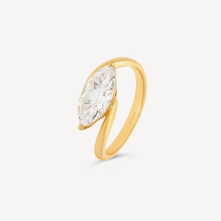 La Bague Premier Regard de By Phoebe se distingue par sa monture en or jaune aux lignes fluides et dynamiques autour du diamant marquise. Le jeu de torsion de l'or ajoute profondeur et caractère, accompagné du diamant blanc qui transmet la protection.