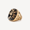 Square yellow gold ring with lace motif set with a jet and crystal center stone with floral motifs.