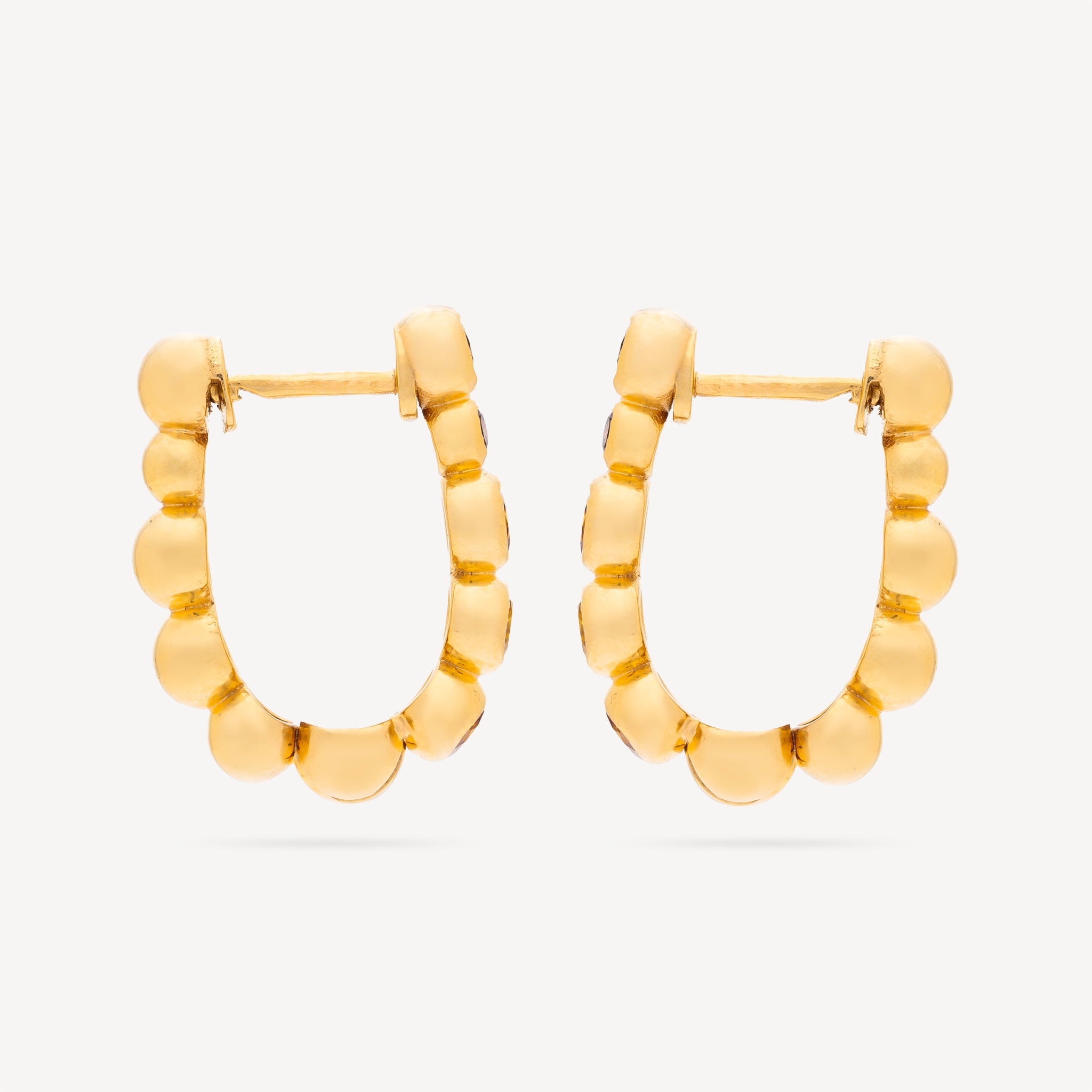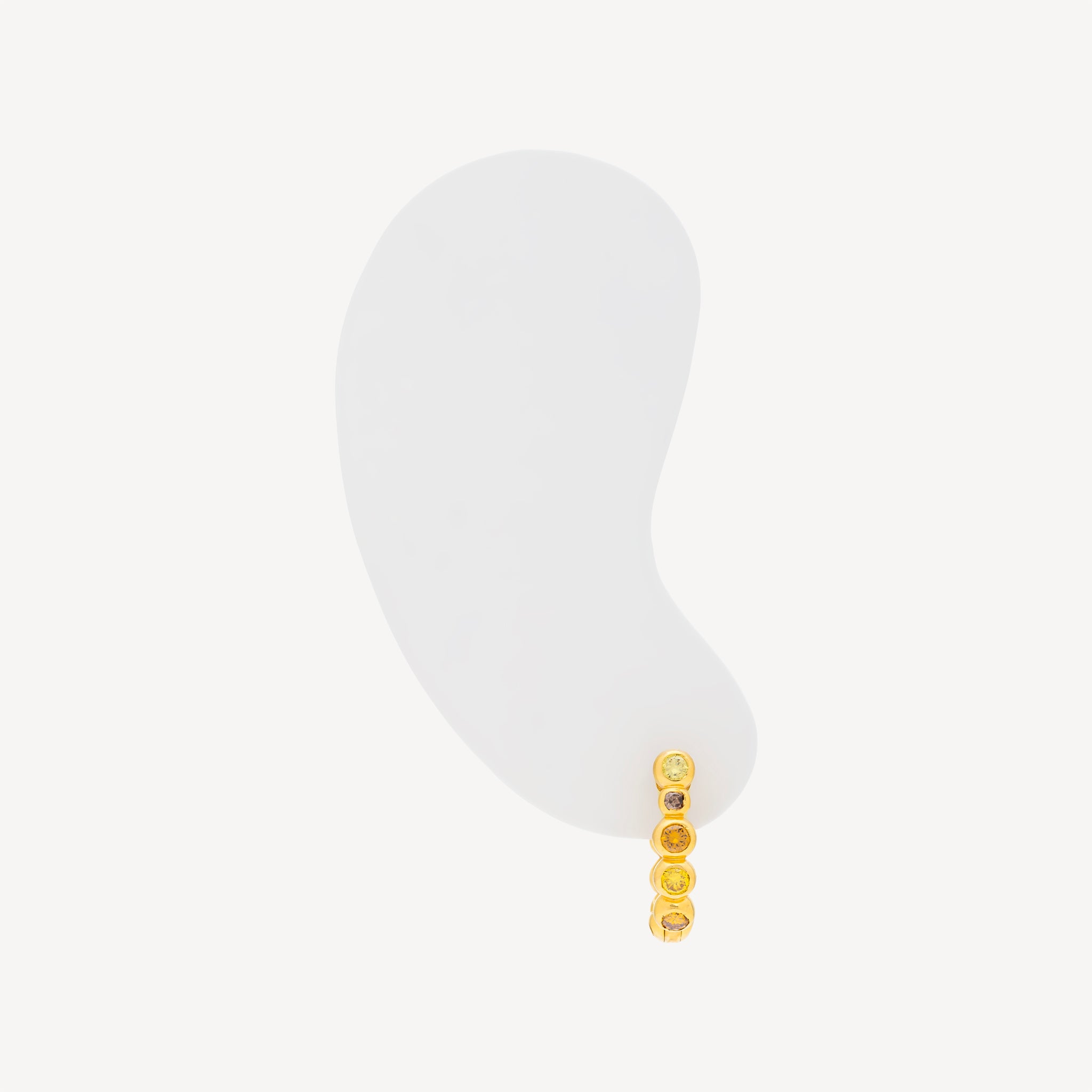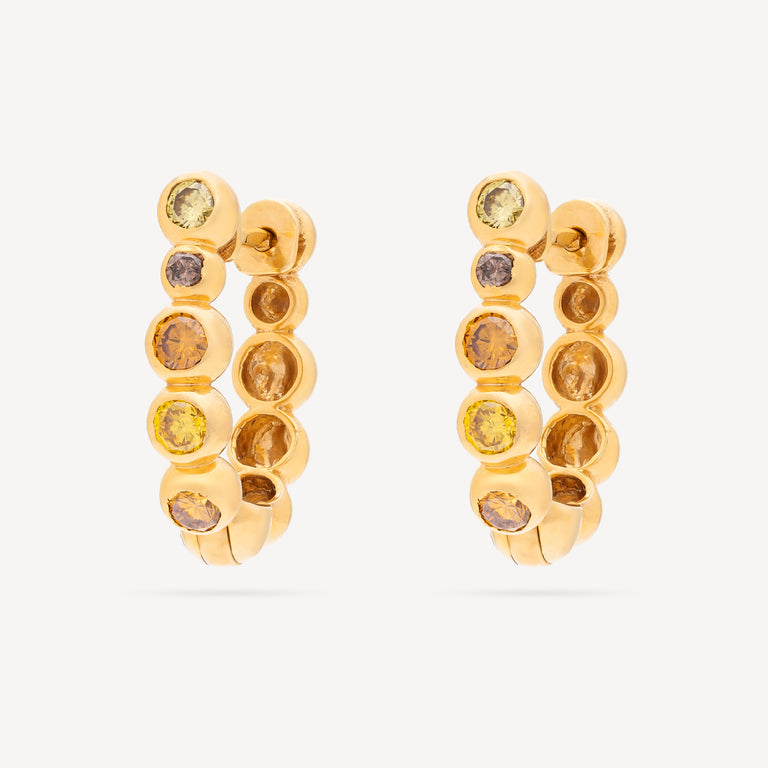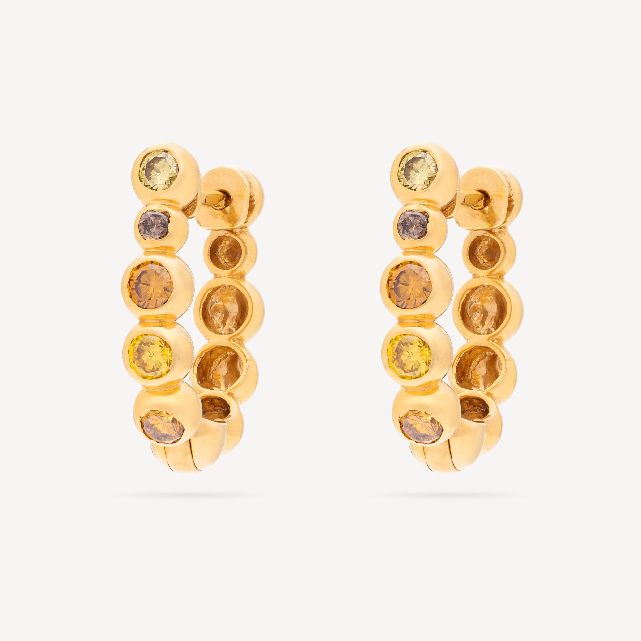Cette paire de créoles Fancy Color Diamond Small, signée Khepri, est confectionnée en or jaune et sublimée par des détails ronds incrustés de diamants. Le diamant, symbole de pureté et de lumière, est considéré comme un puissant amplificateur d’énergie.