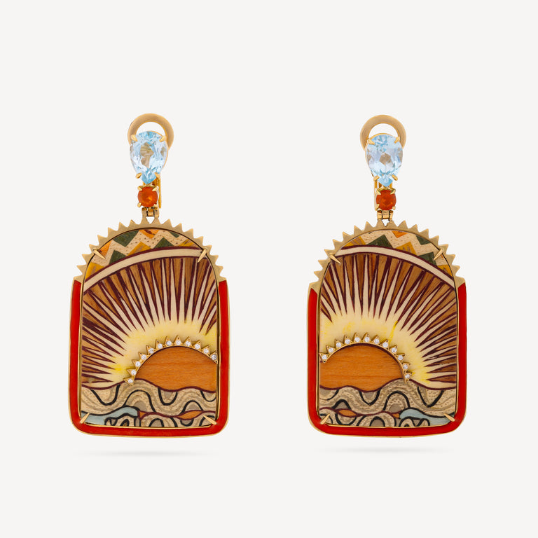 These Window Sunset earrings reveal an inlaid sunrise, illuminated by touches of opal and topaz. Opal is a mystical stone that nourishes the imagination and amplifies positive emotions. Topaz is a stone that enlightens the mind and heart, bringing clarity, serenity and inner strength to reveal your true light.