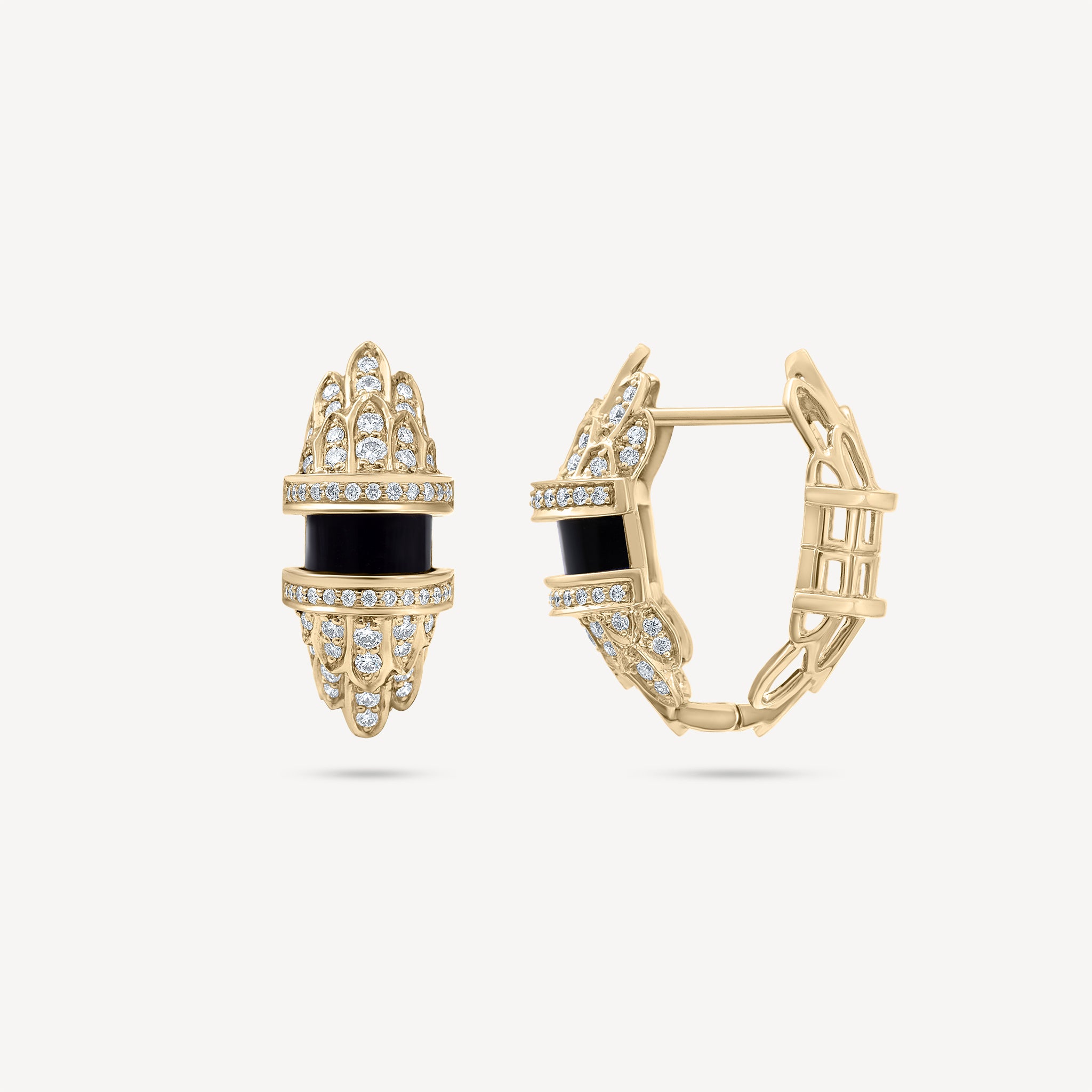 Les boucles d'oreilles Soaring Heights Hoops de Mirari incarnent l'élégance par le contraste des couleurs. Dotées d'une pierre centrale noire, elles sont sublimées par les diamants blancs pavés. Cette composition crée une profondeur visuelle, où chaque diamant amplifie l'intensité de la pierre centrale. Le diamant élève l’esprit et fortifie la volonté.