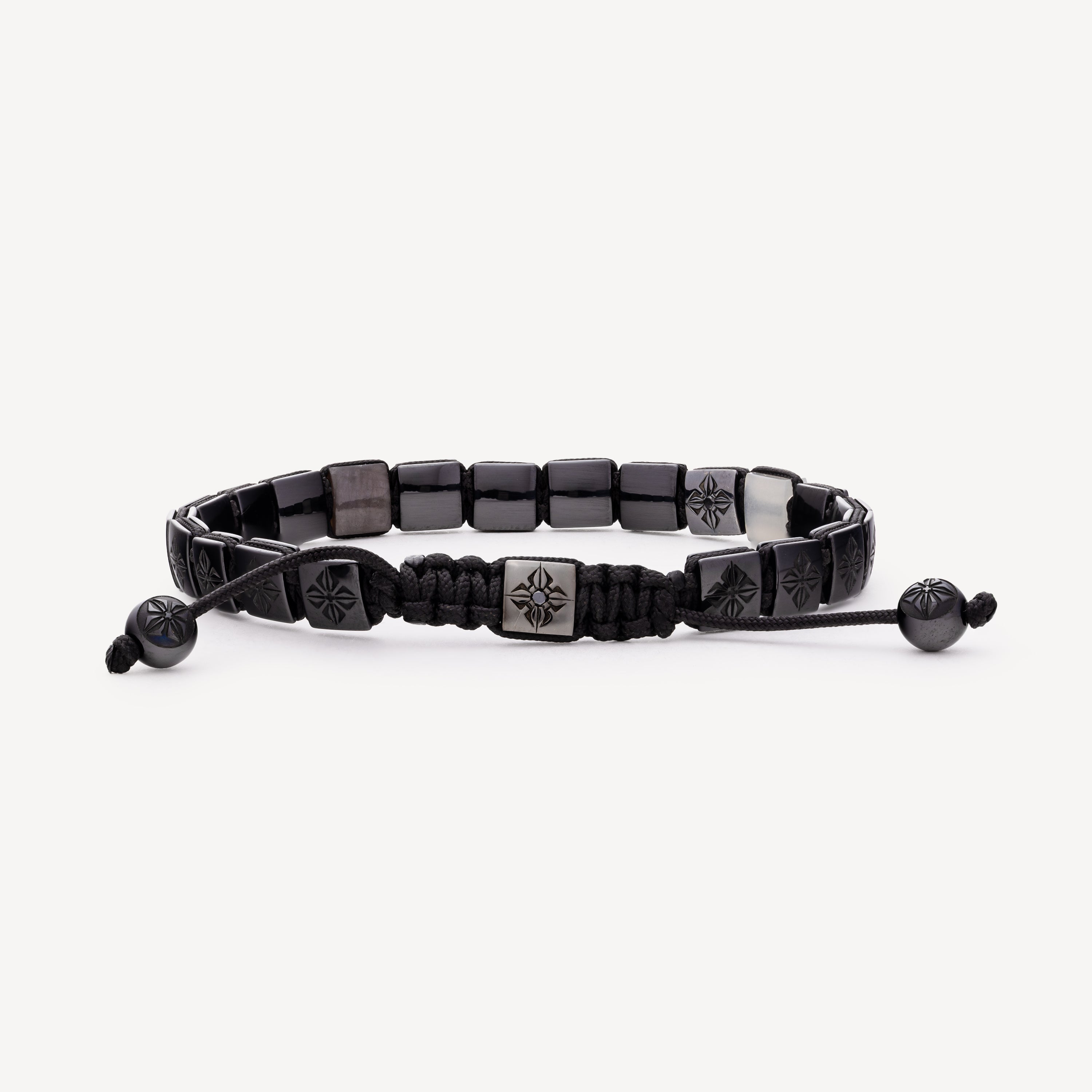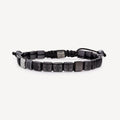 Bracelet mounted on a black cord composed of : 18 black ceramic locks, a grey sapphire lock, a grey moonstone lock, 2 black ceramic beads, a black gold lock adorned with black diamonds, and a black gold lock adorned with a black diamond.