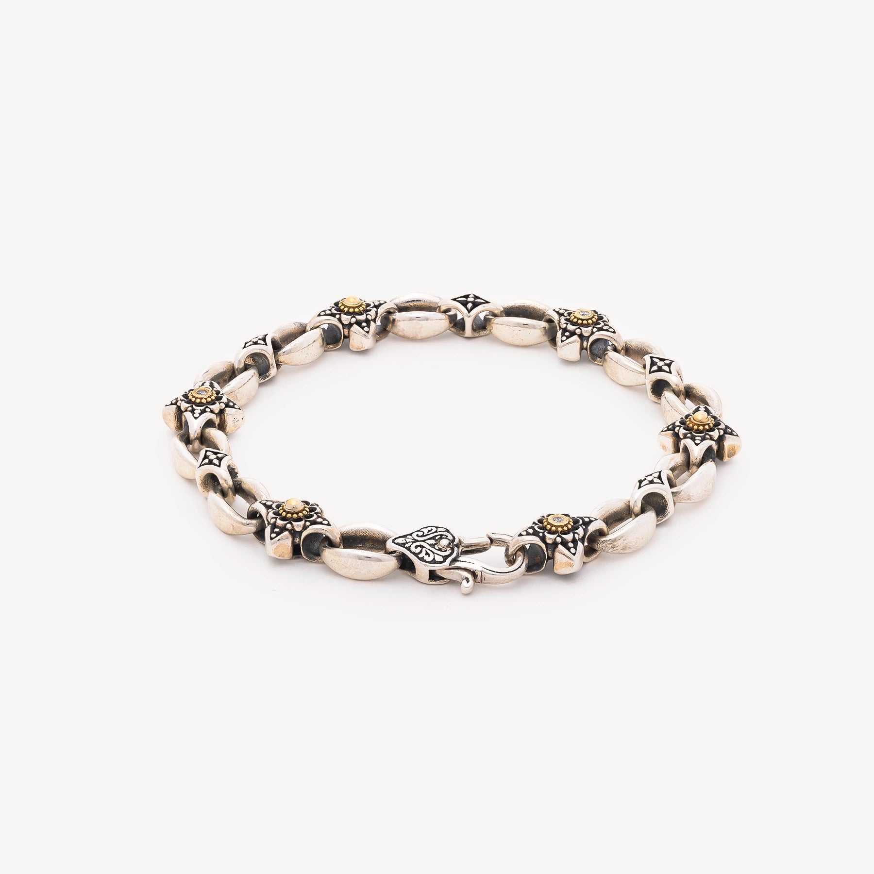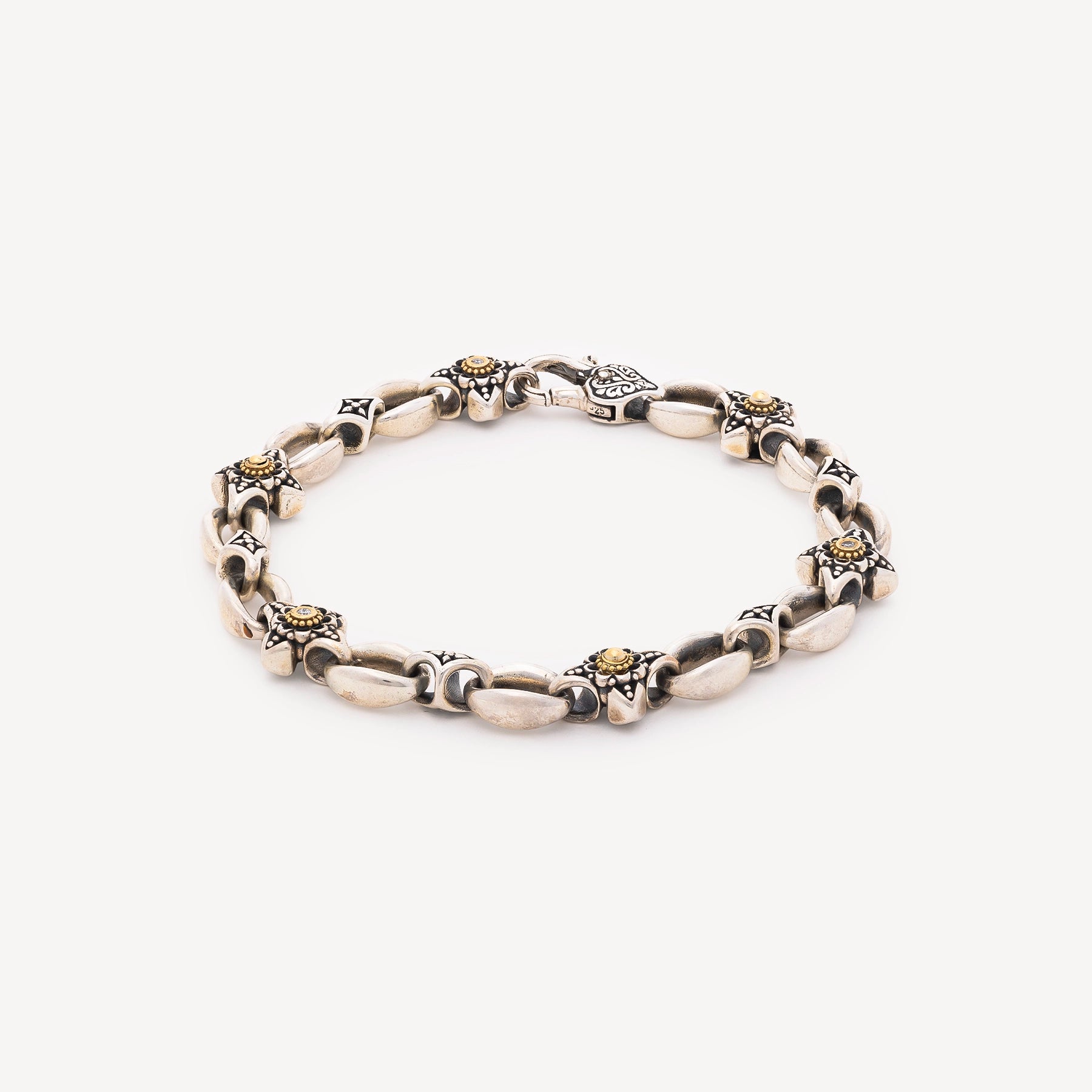 The Amazona bracelet by Konstantino combines the sparkle ofSilver the warmth of yellow gold with a series of white diamonds delicately pavé-set along the entire length of the bracelet. This composition gives the piece a perfect balance between modernity and sophistication. White diamonds are known to stimulate mental clarity, strengthen inner strength, and protect against negative energies.