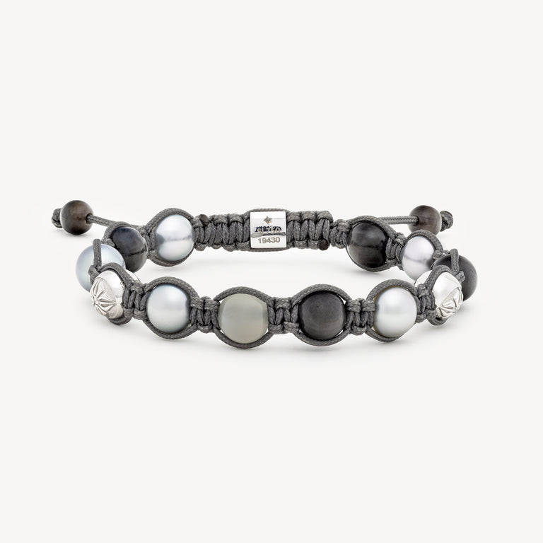 Bracelet mounted on a gray cord composed of 14 beads and 1 lock: 6 gray sapphire beads, 5 silver ceramic beads, 1 moonstone bead, 2 white gold beads set with two white diamonds, and a white gold lock set with a white diamond.