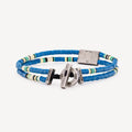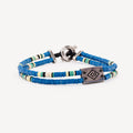 Bracelet mounted on a black cord featuring two lines of predominantly blue African pearls and a piece of Silver with a tribal motif.