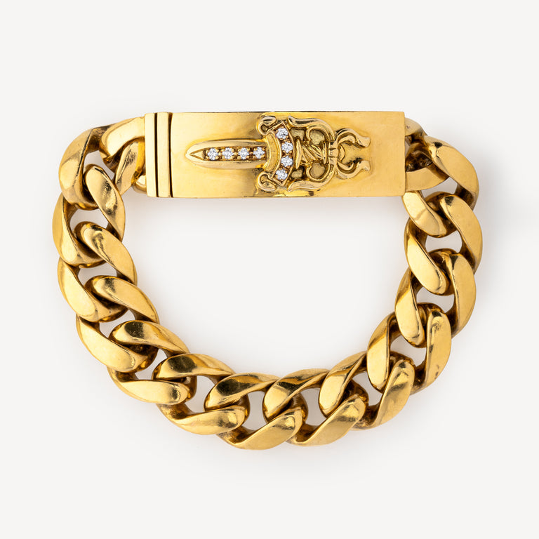 Yellow gold chain bracelet with large cross clasp adorned with white diamonds.