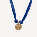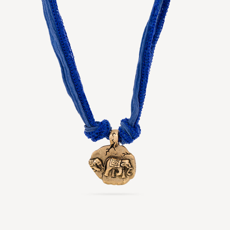 Bronze charm with elephant on one side and "Pursue of wisdom" on the other. Sold with indigo blue silk ribbon and in its original pouch.