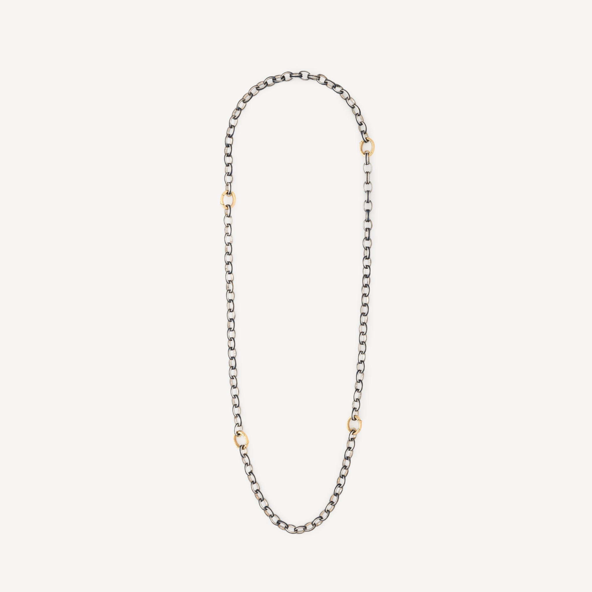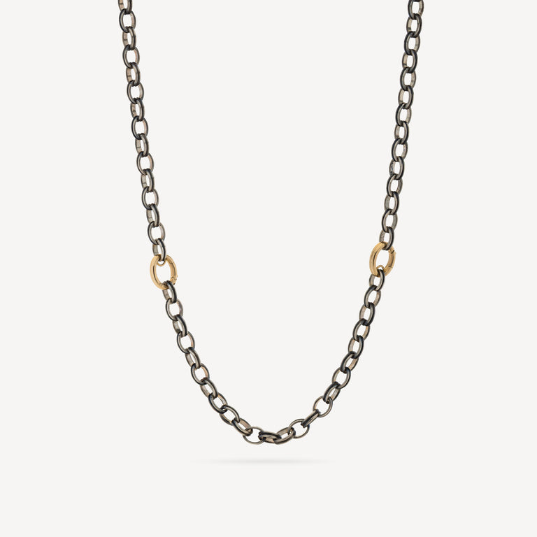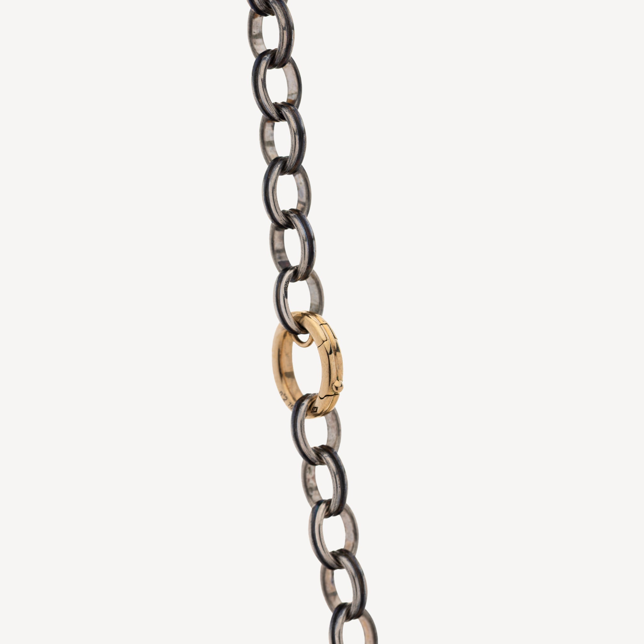 Collier chaîne anneau Medium en or jaune et argent, création signée Elie Top. Cette pièce conjugue deux métaux précieux en harmonie parfaite, offrant une polyvalence stylistique remarquable. Idéal pour les amateurs de bijoux intemporels qui apprécient la subtilité du contraste métallique.