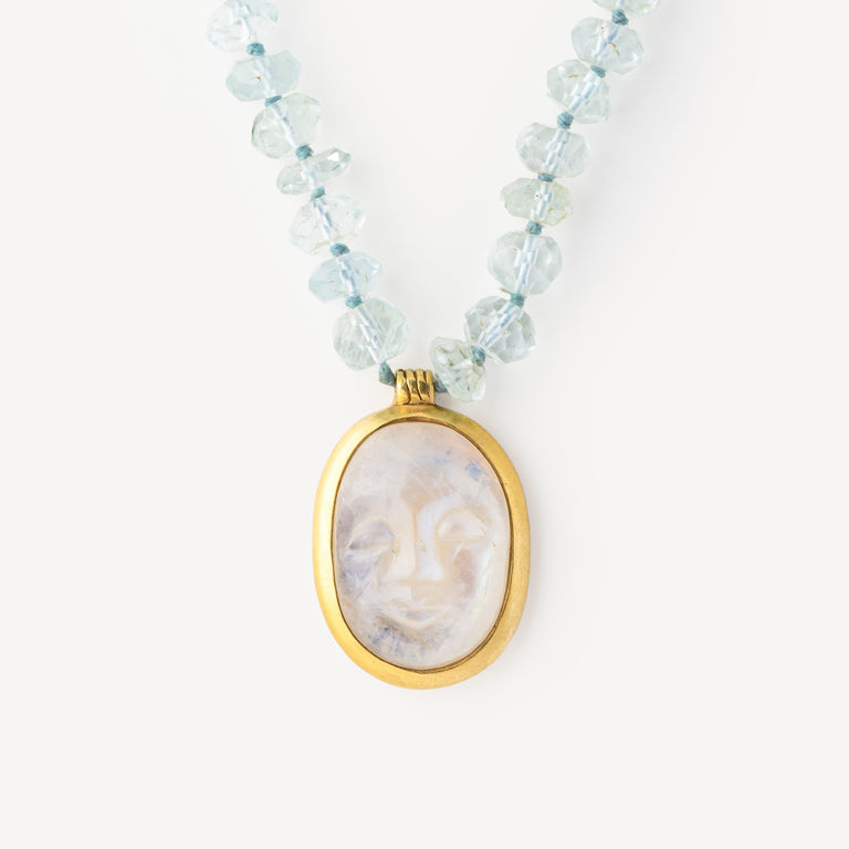 Aigues Marine double tour sautoir necklace with yellow gold pendant and Rainbow moonstone face.