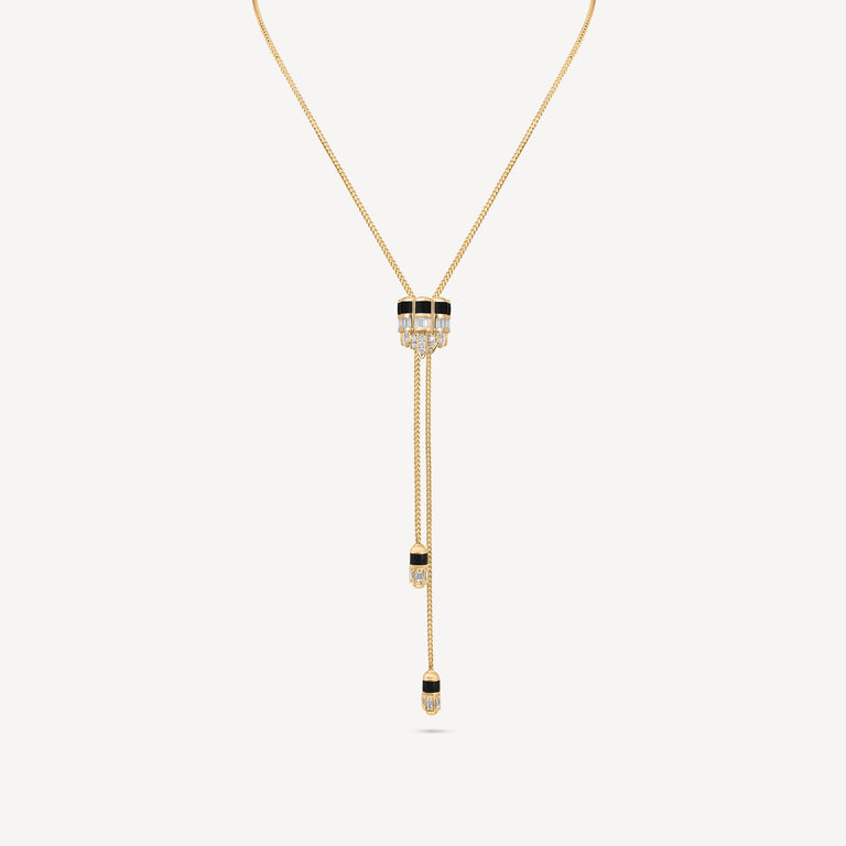 Plongez dans l'univers du collier Empire Rondell en or jaune, une création de la collection Empire State par Mirari. Cette pièce épurée marie l'intensité du noir profond de l'émail avec la pureté scintillante des diamants blancs, offrant un contraste dramatique et intemporel. Le diamant encourage la vérité, la force et la stabilité émotionnelle.