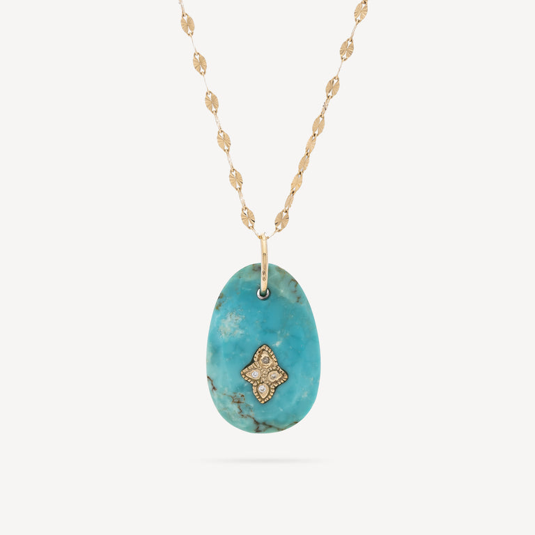 Yellow gold necklace with turquoise pendant adorned with white diamonds.