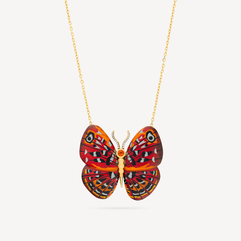 Let the Marquetry Butterfly necklace bewitch you, a creation by Silvia Furmanovich in yellow gold, sublimated by diamonds and opalescent opals. The butterfly, symbol of transformation and eternal beauty, expresses itself here with incomparable jeweled precision. Diamonds amplify the inner light and strength of the soul, promoting spiritual clarity and self-confidence.