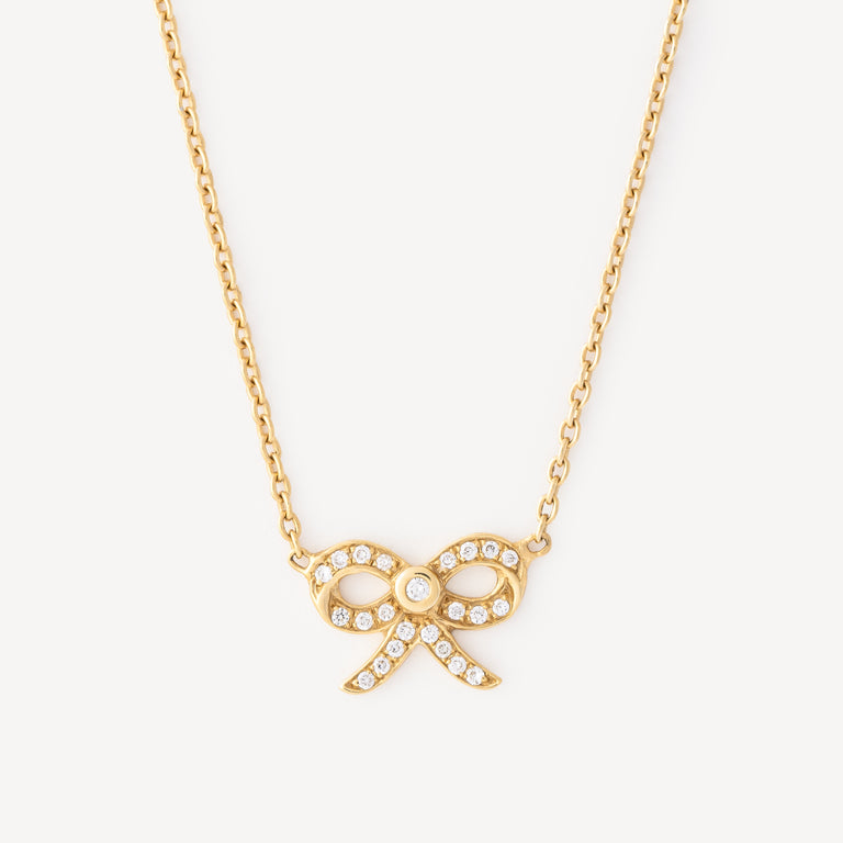 Yellow gold necklace with bow pendant adorned with white diamonds.