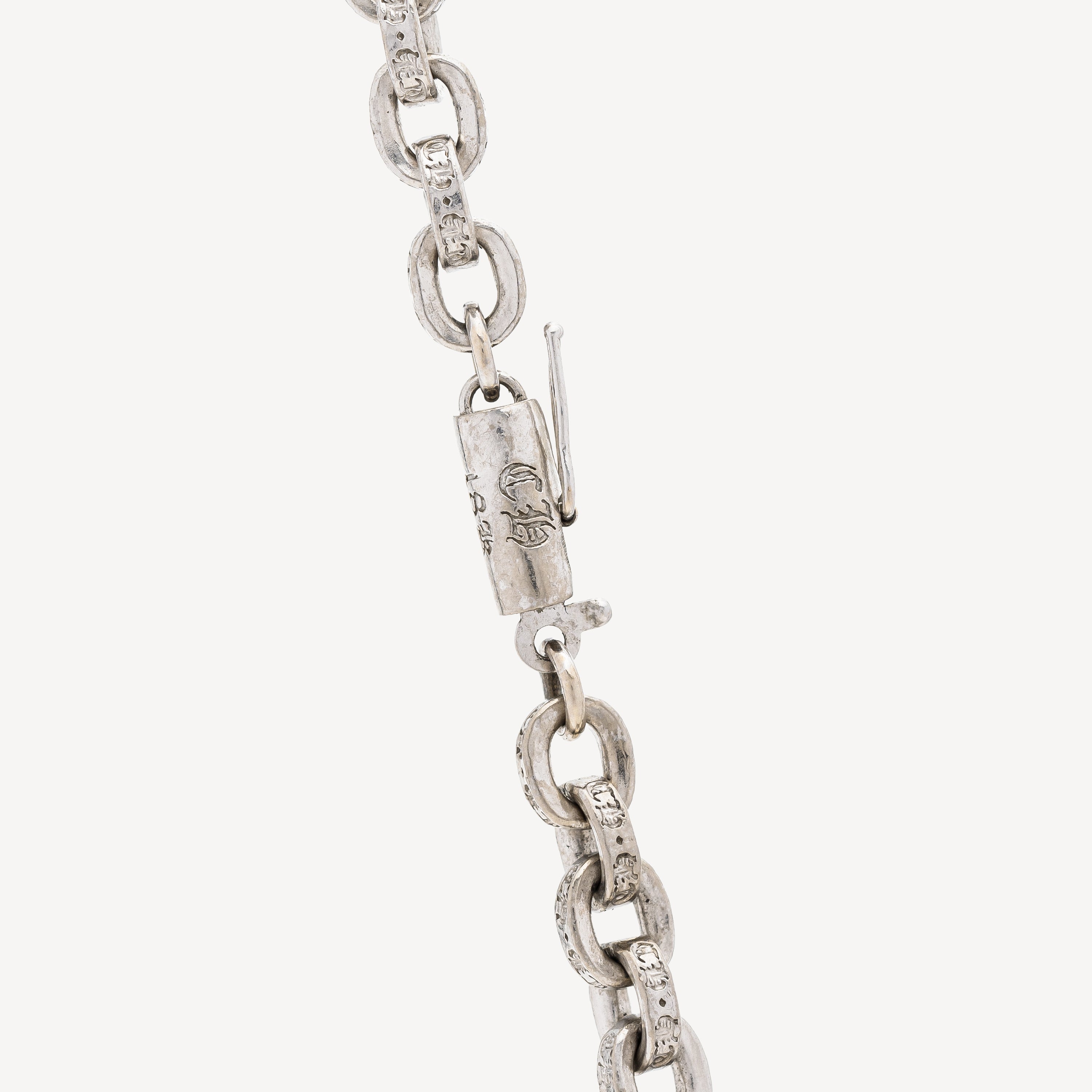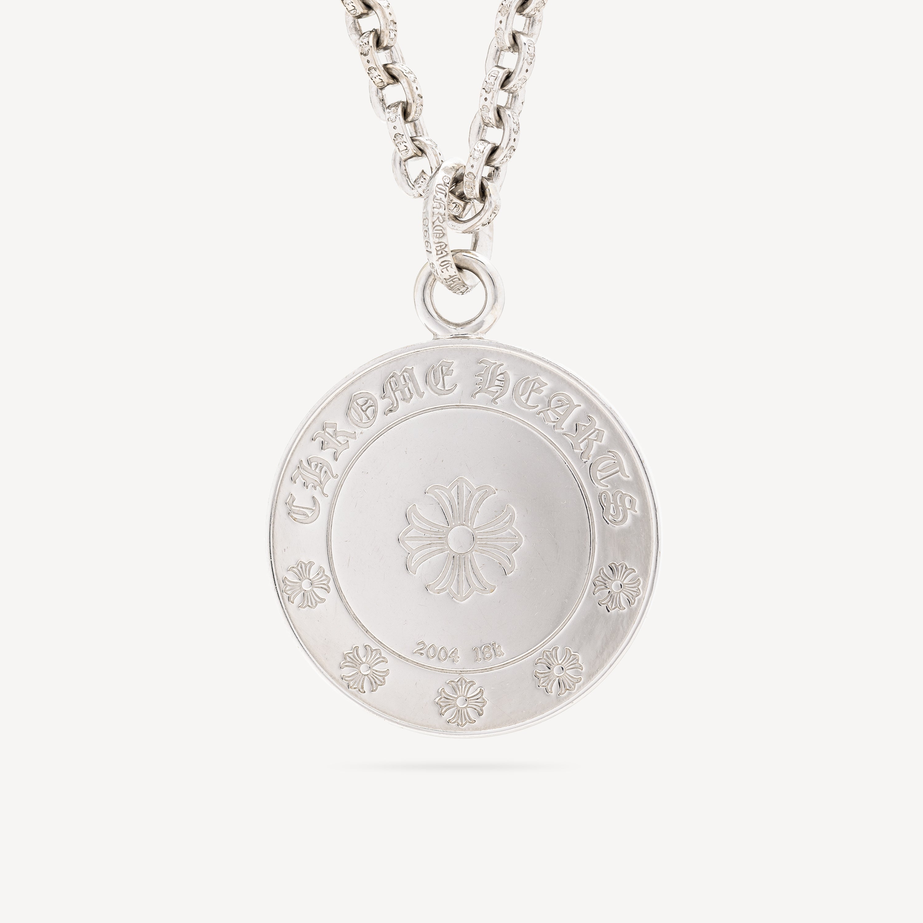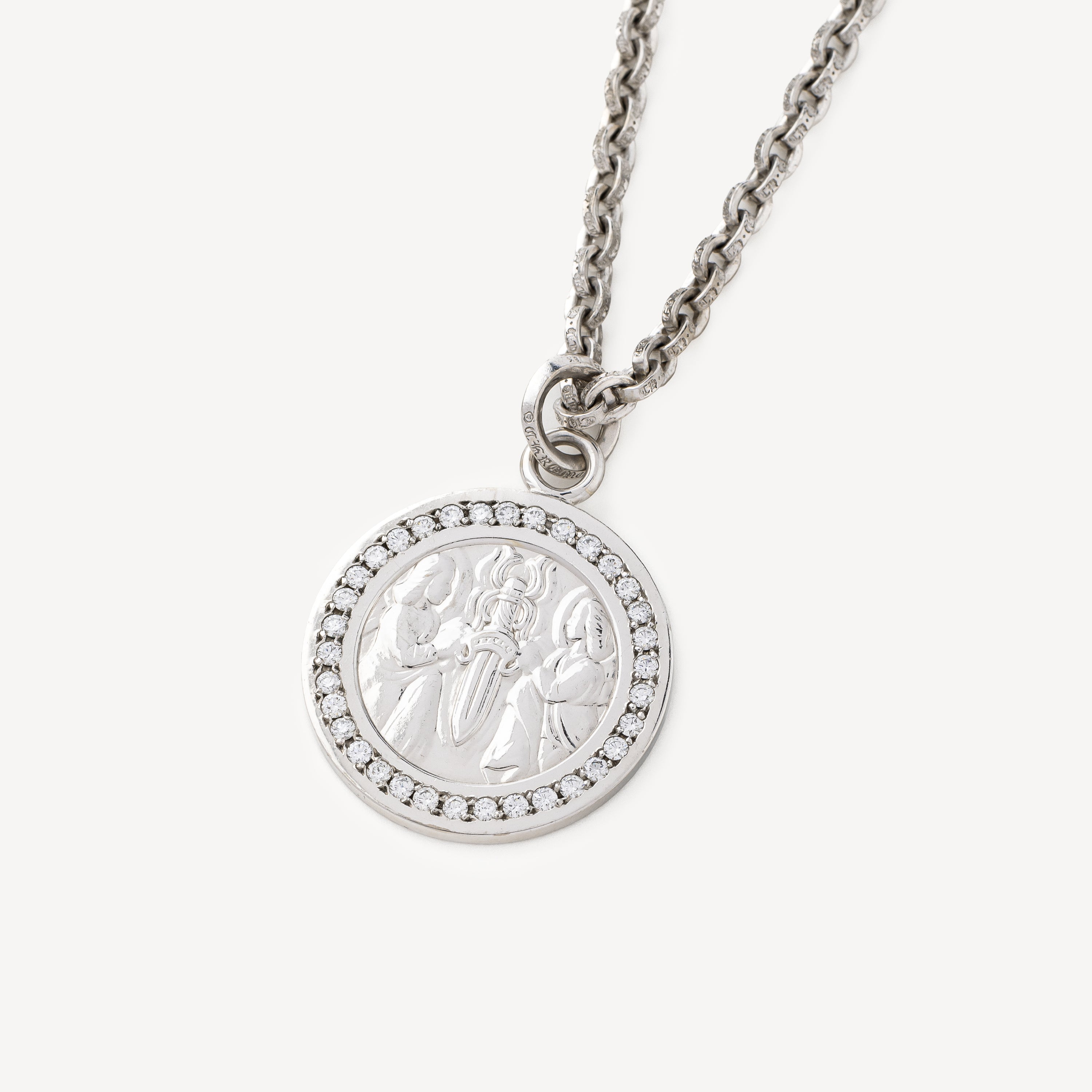 White gold chain with white gold angel medallion adorned with a cross on the reverse and white diamonds.