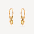 Indie Saphir mini creoles are mounted on a 14-carat yellow gold ring, and set with a suspended drop-shaped yellow sapphire in the center, wrapped with gold threads. As each stone is unique, there is a slight color difference between the 2 stones.