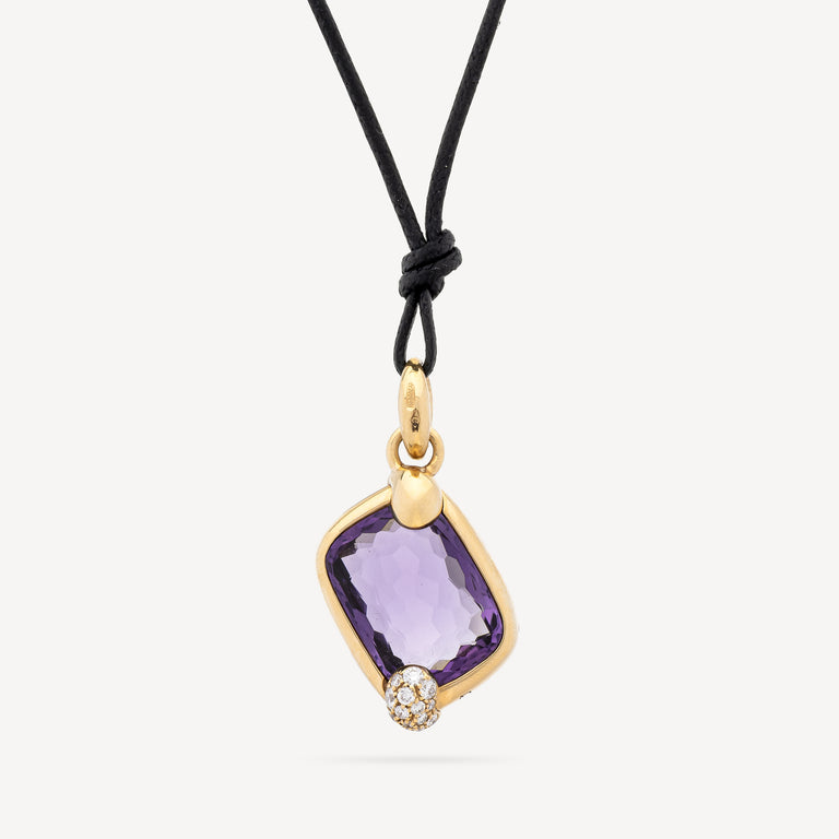 Magnificent pendant necklace in yellow gold adorned with an amethyst and a claw paved with white diamonds.