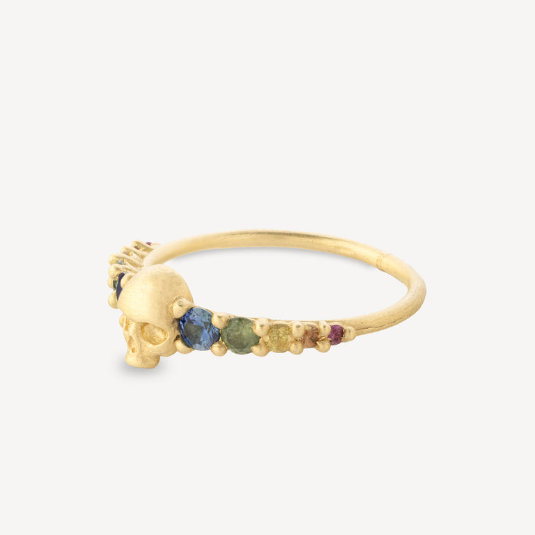 Explore the singular elegance of this small skull sublimated by rainbow sapphires carefully arranged in round and gradated patterns, overhanging a halo ring in 18-carat recycled yellow gold. This creation embodies a perfect balance between the subtlety of the design and the captivating brilliance of the precious stones. Immerse yourself in a world where luxury merges harmoniously with a modern, welcoming aesthetic.