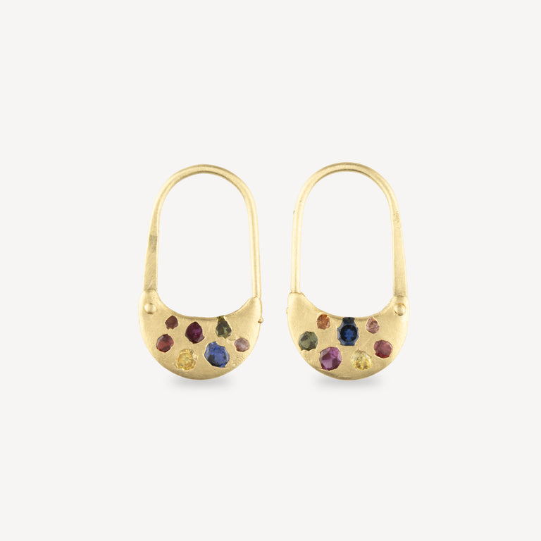 These earrings embody subtle, luxurious elegance, where captivating rainbow-hued sapphires are meticulously integrated into a pair of safety-pin hoop earrings in 18-carat recycled yellow gold. This artistic fusion of colors and materials evokes modern sophistication, while offering a warm, welcoming touch. This exquisite jewelry adds a touch of delicate glamour to your look, while preserving a refined, accessible aesthetic.
