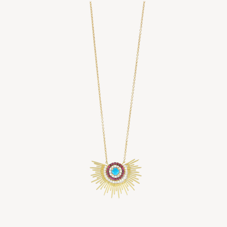 - Materials: Yellow gold, White diamond, Ruby, Turquoise