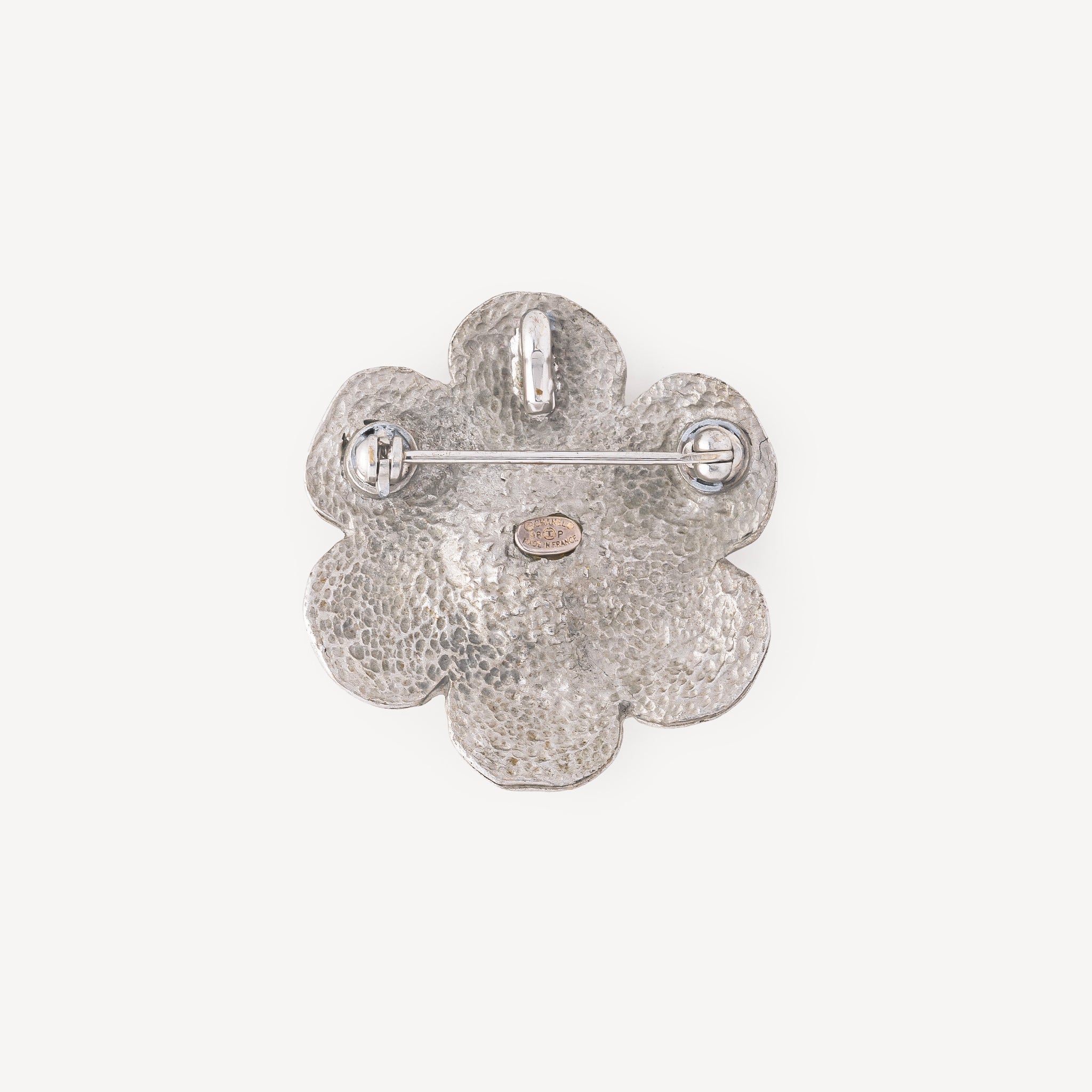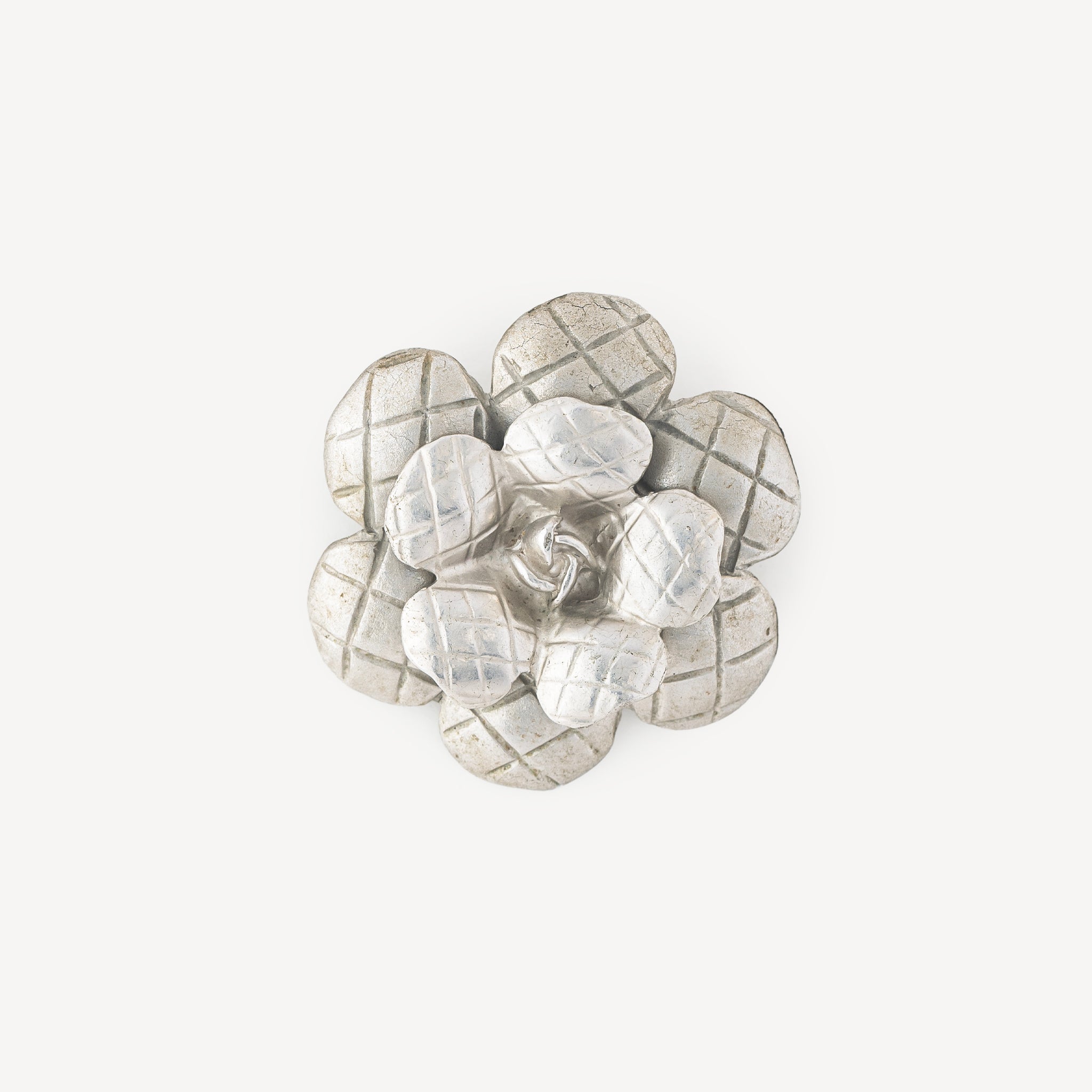 Broche Chanel Camélia en argent vintage datant de 1998.
