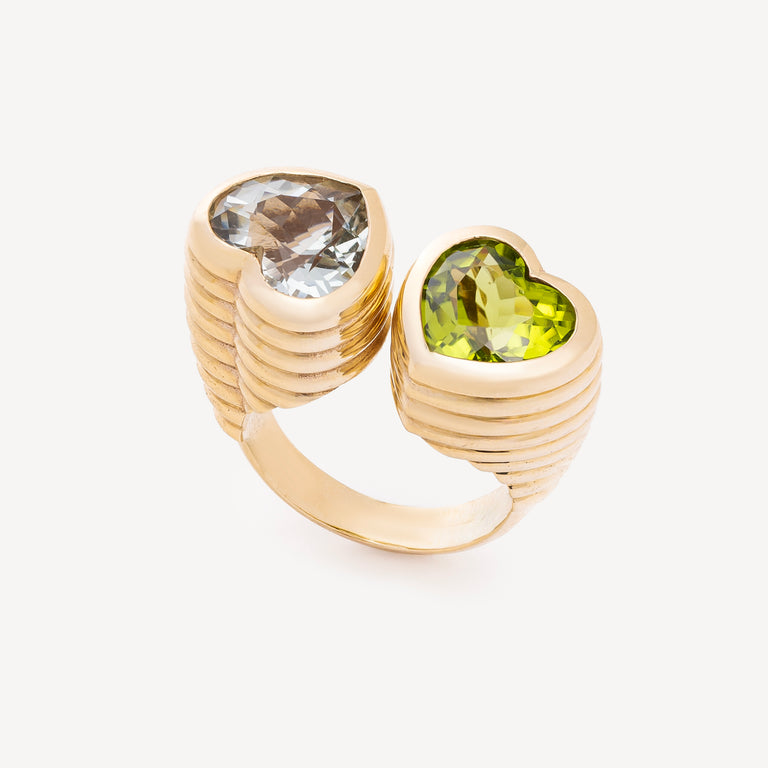 La bague Stacey Amethyst en or jaune d'Auroro se distingue par son design chunky audacieux, mettant en scène deux cœurs sertis d’améthystes vertes vibrantes. Pierre spirituelle par excellence, l’améthyste apaise les pensées, aide à la méditation, favorise l’équilibre émotionnel et protège des énergies négatives.