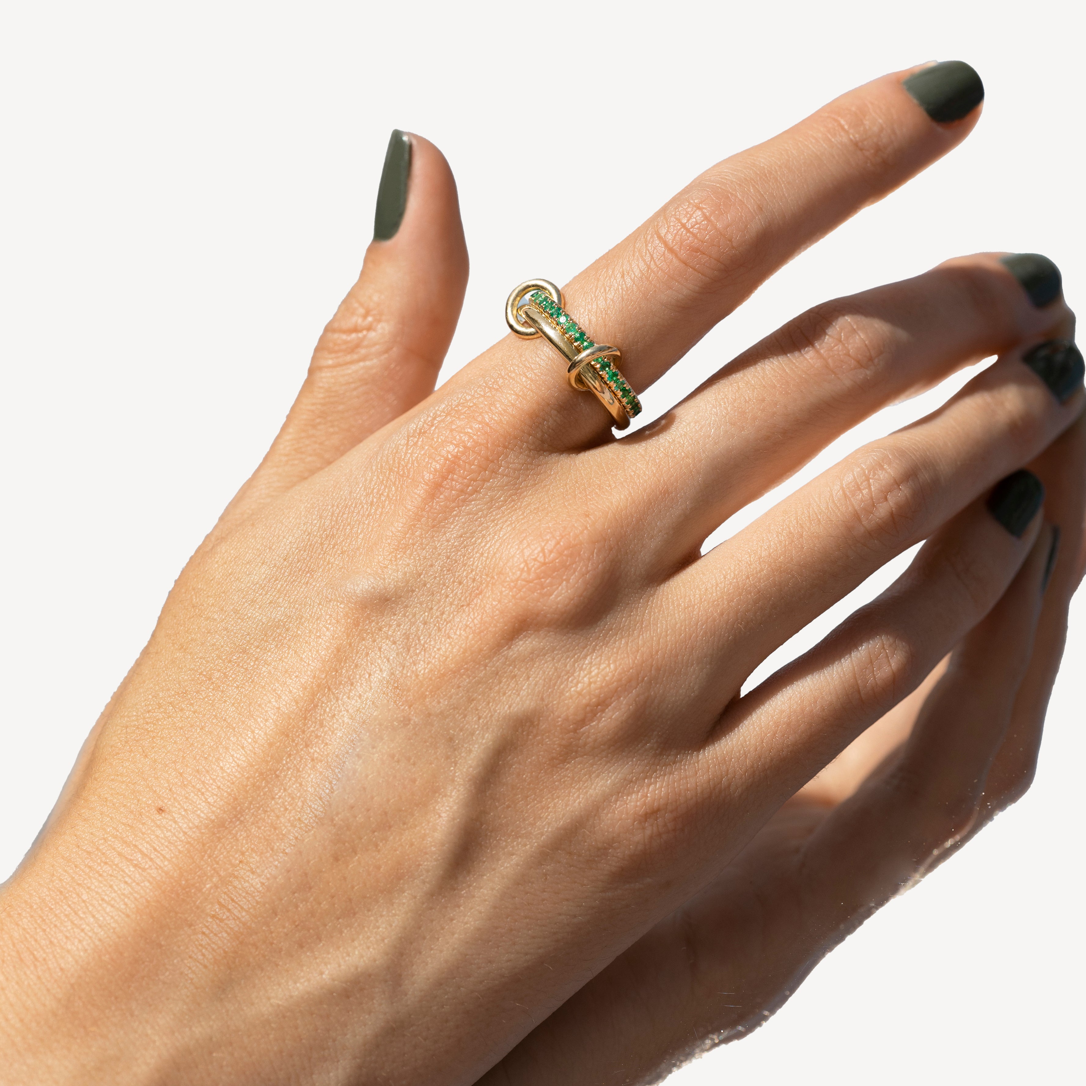 Symbole d’union, la bague Ceres associe deux anneaux liés : un pavé d’éternité et un anneau central, reliés par des connecteurs mobiles. En or 18ct, elle allie éclat et élégance au quotidien.