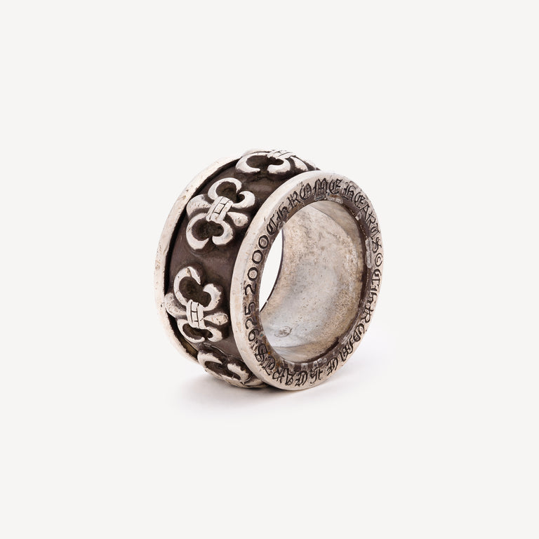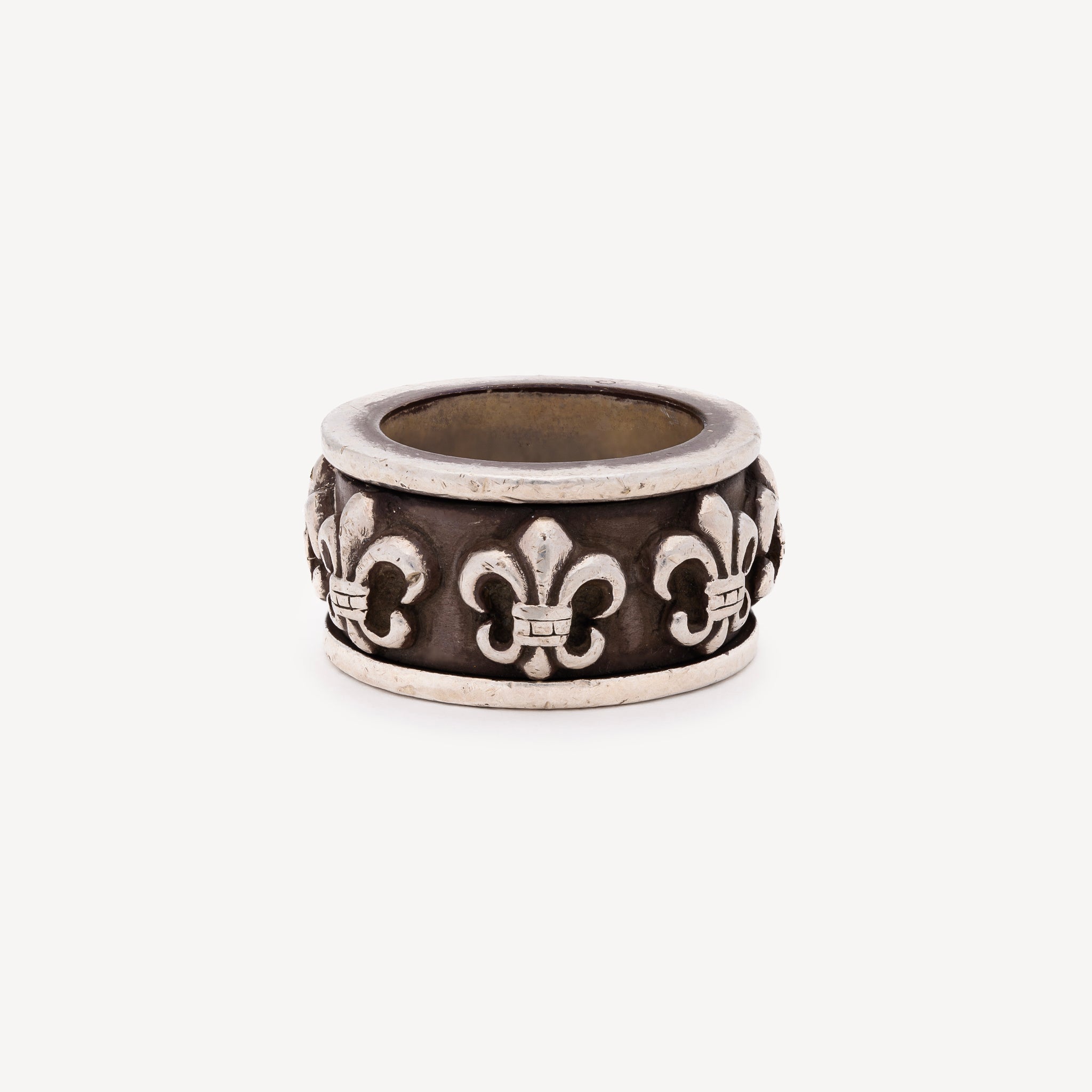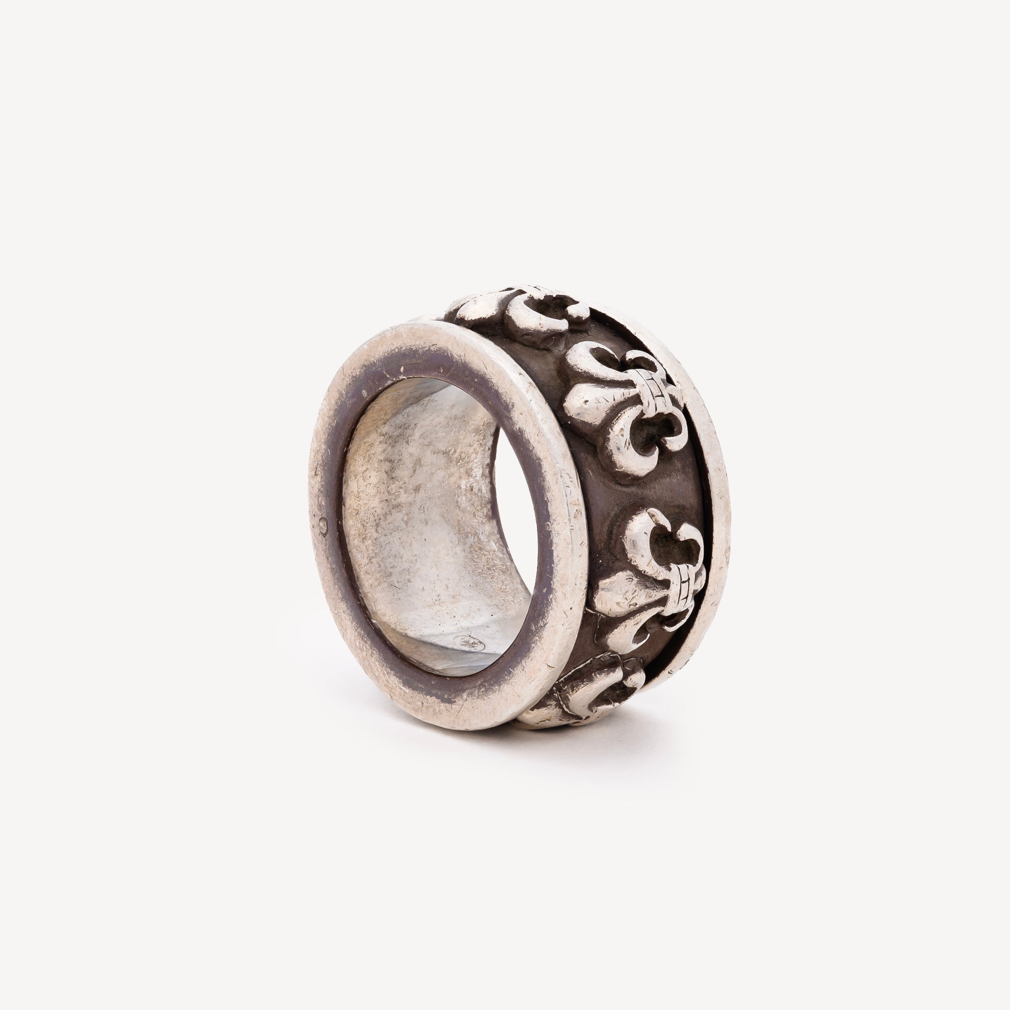 Bague en argent avec pièce bande centrale tournante ornée de fleurs de lys.