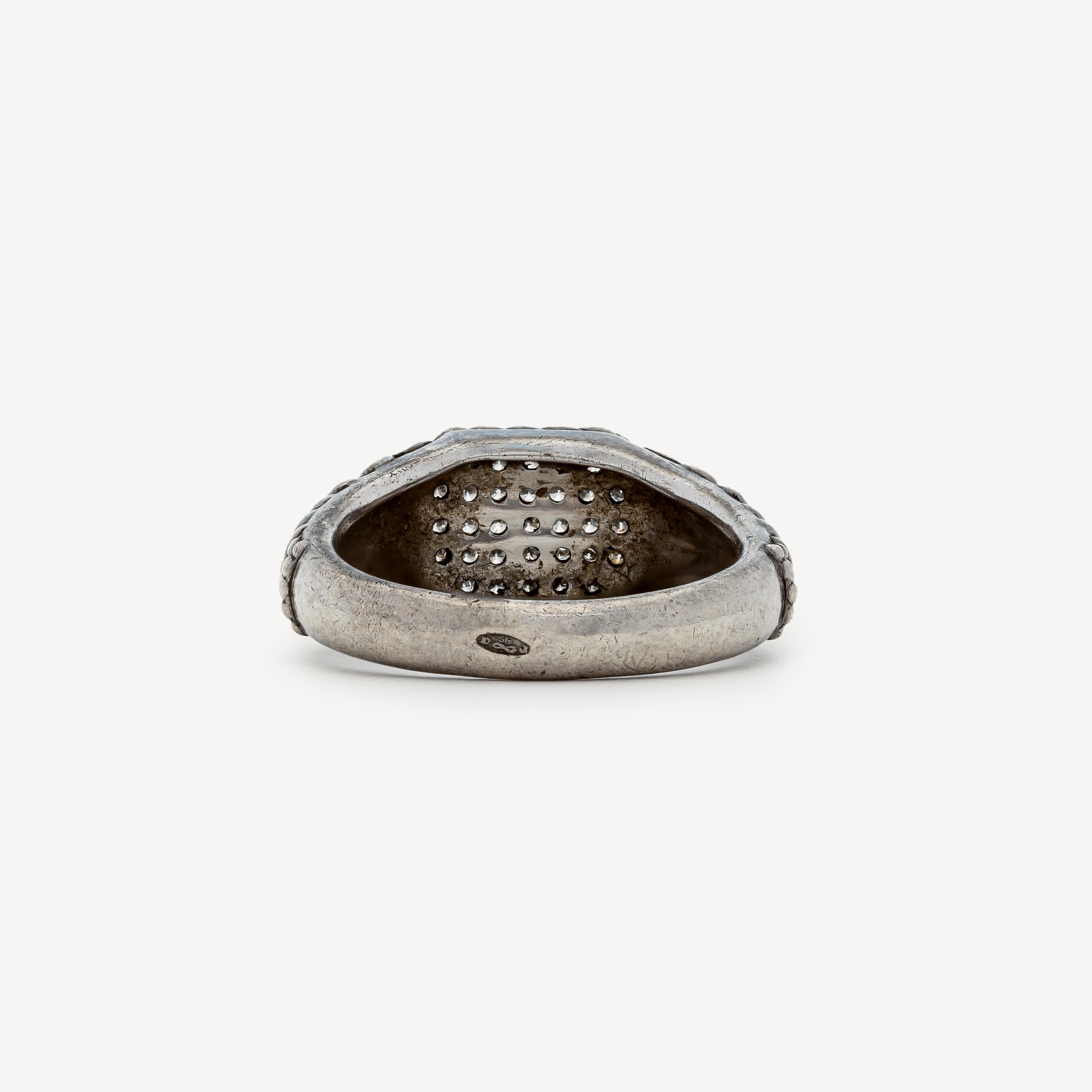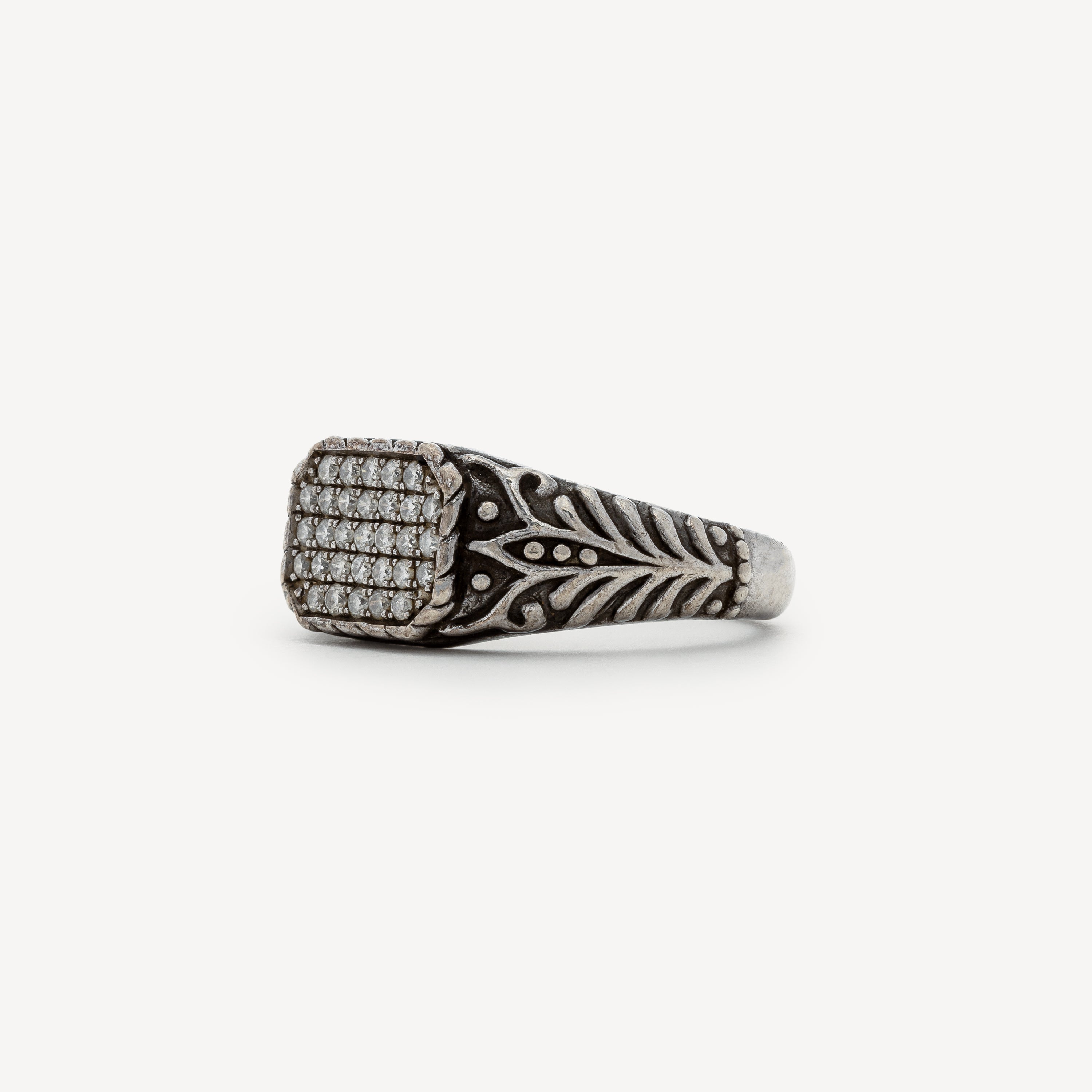 Bague de petit doigt en argent avec rectangle central pavé de diamants blancs.