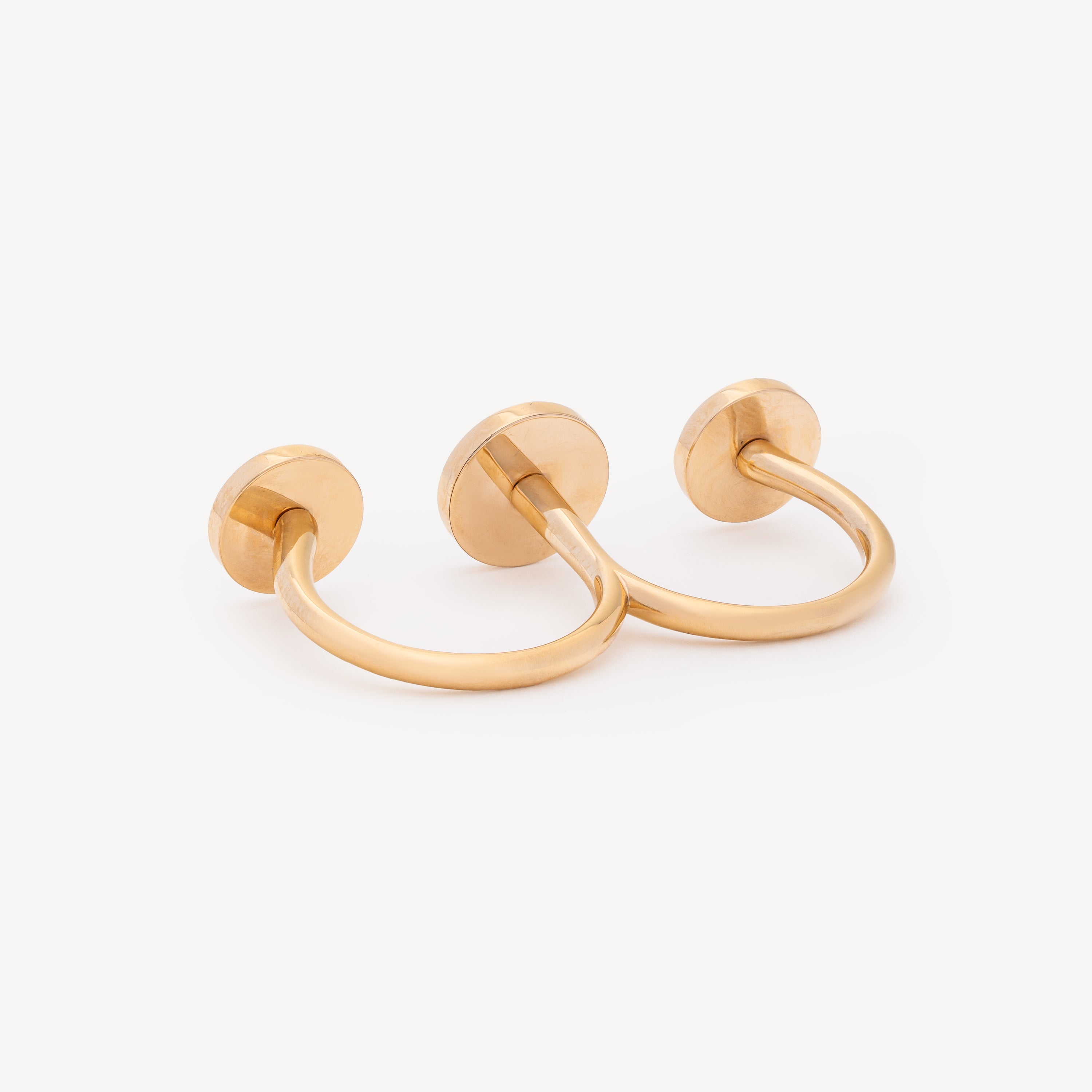 Cette bague double présente deux anneaux ainsi qu’un trio de pierres en malachite et nacre.