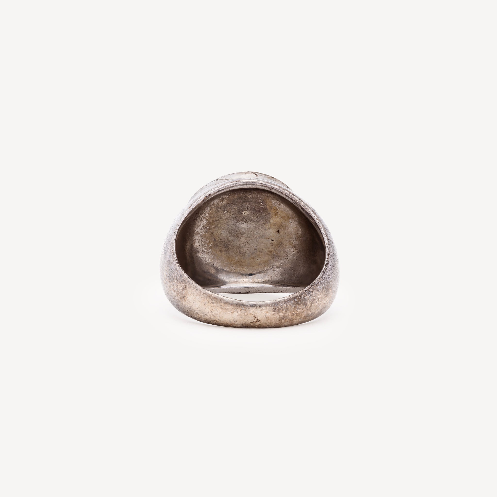 Chevalière en argent décorée d’une croix ornée de diamants blancs.