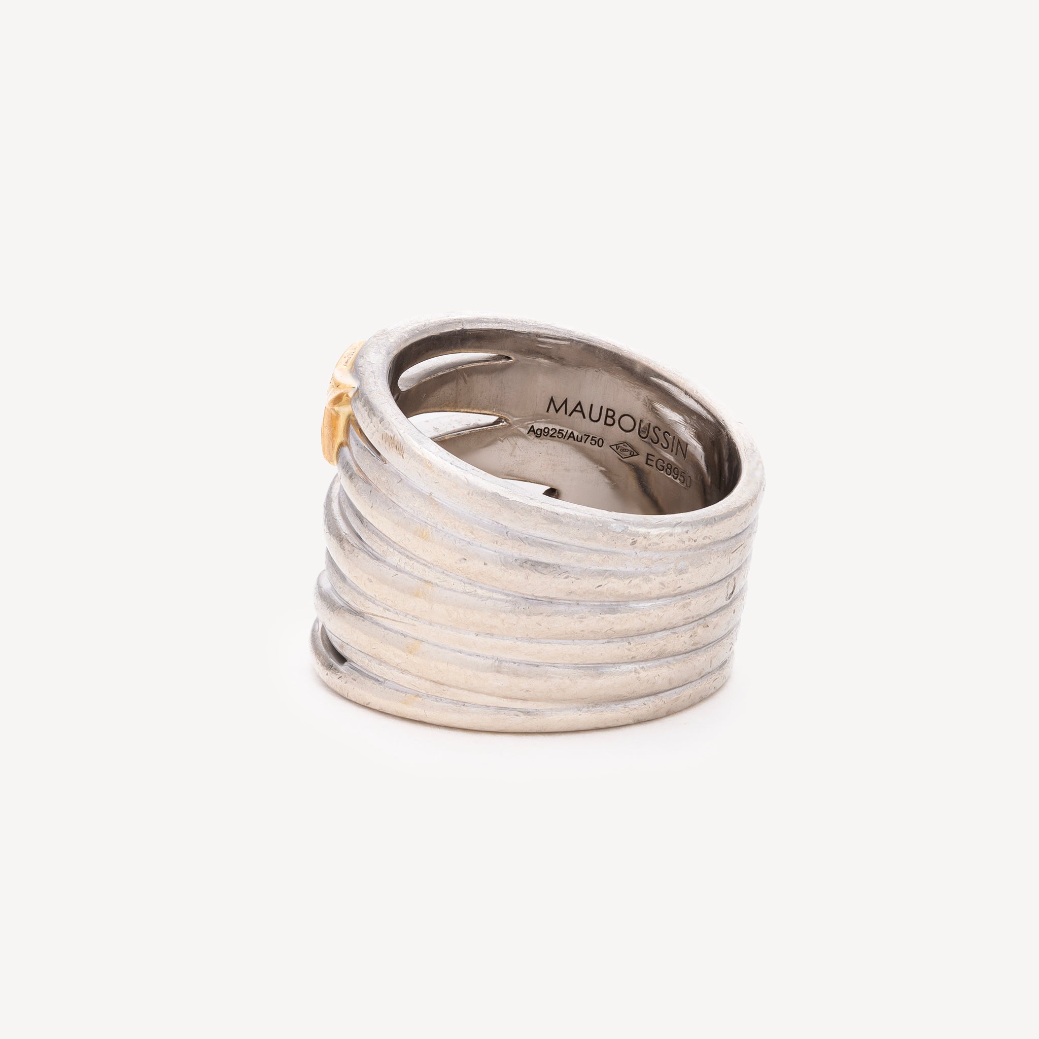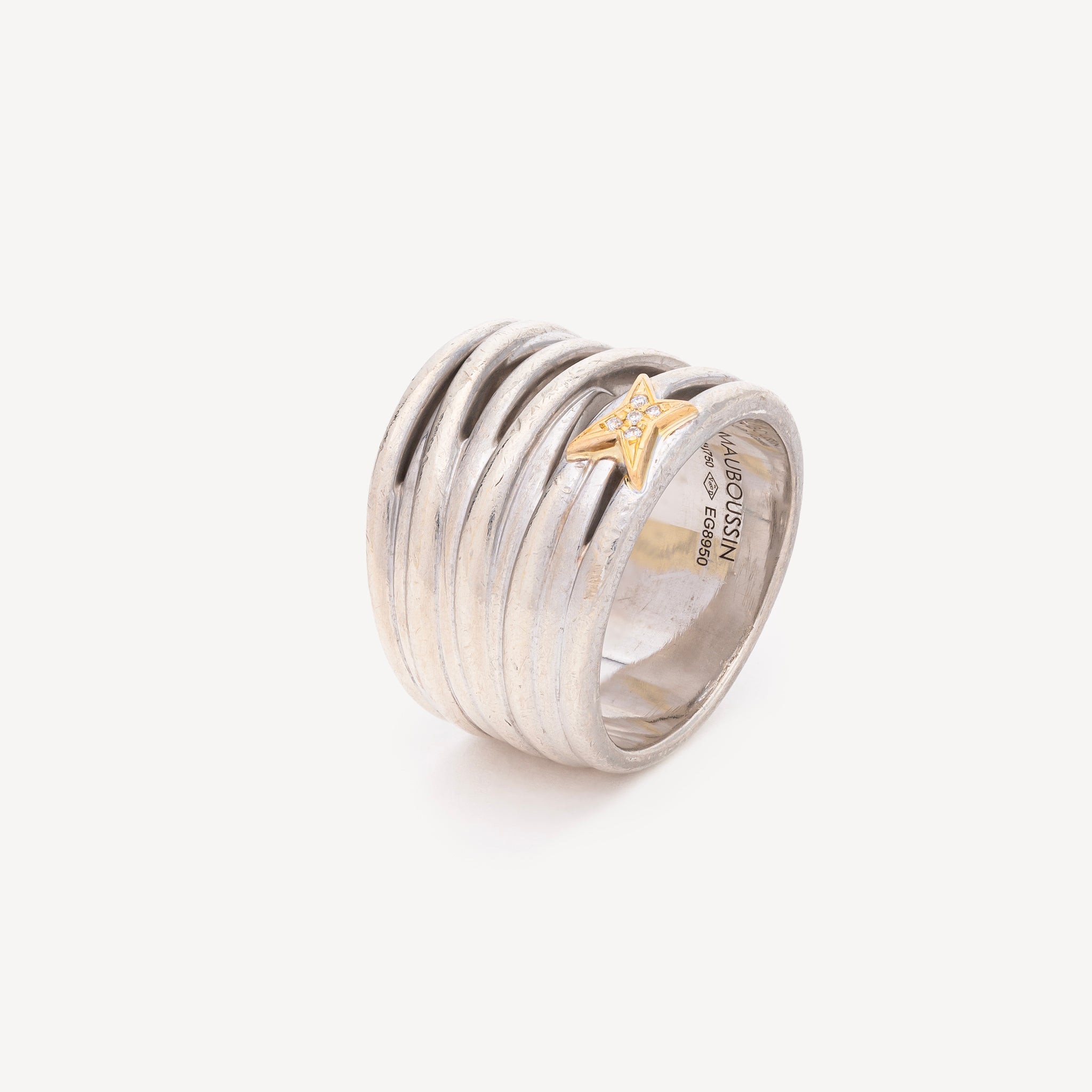 Bague signature de la Maison, la bague Kiff and Kiss entremêle des filaments d'argent ornés de l'étoile Mauboussin en or jaune et pavée de diamants. Le diamant blanc symbolise la pureté absolue, il éclaire l’esprit, renforce la clarté intérieure et apporte équilibre et harmonie émotionnelle.