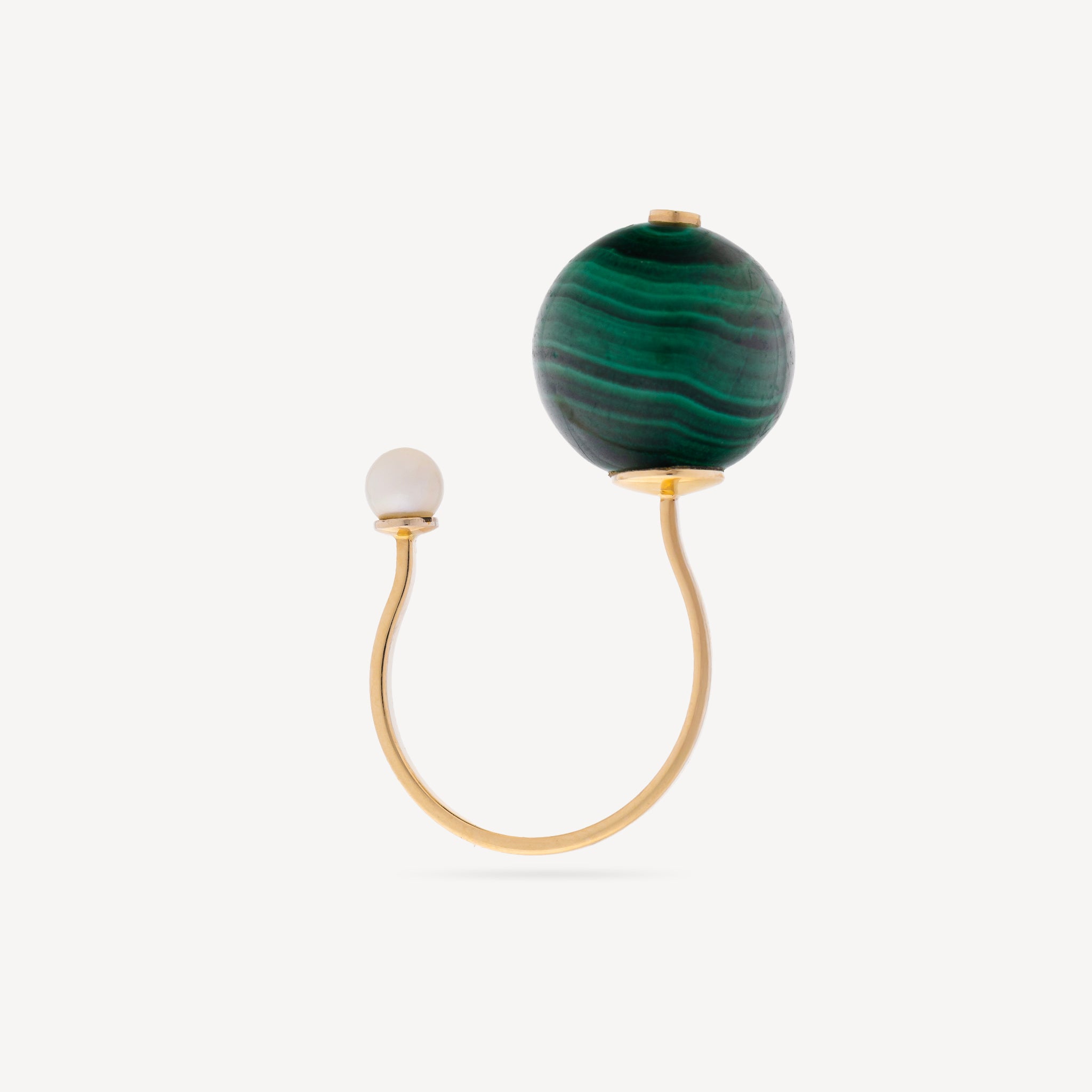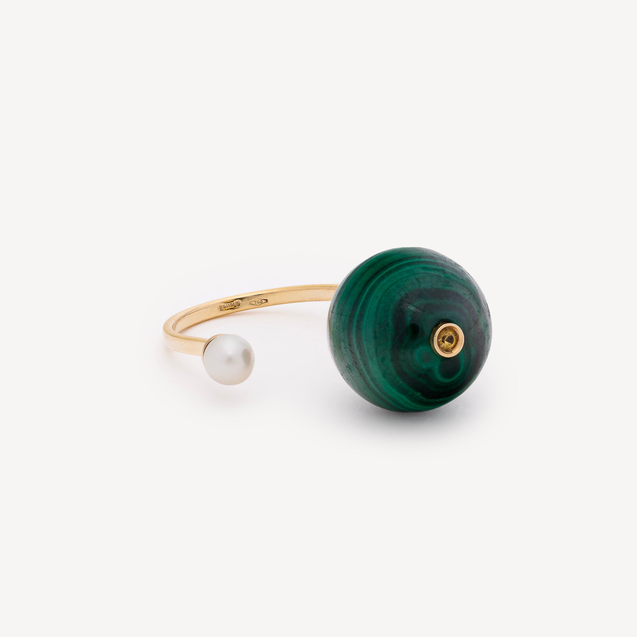 Bague en or jaune ornée d’un côté d’une grande malachite et d’un saphir jaune sur le dessus et de l’autre côté d’une perle.