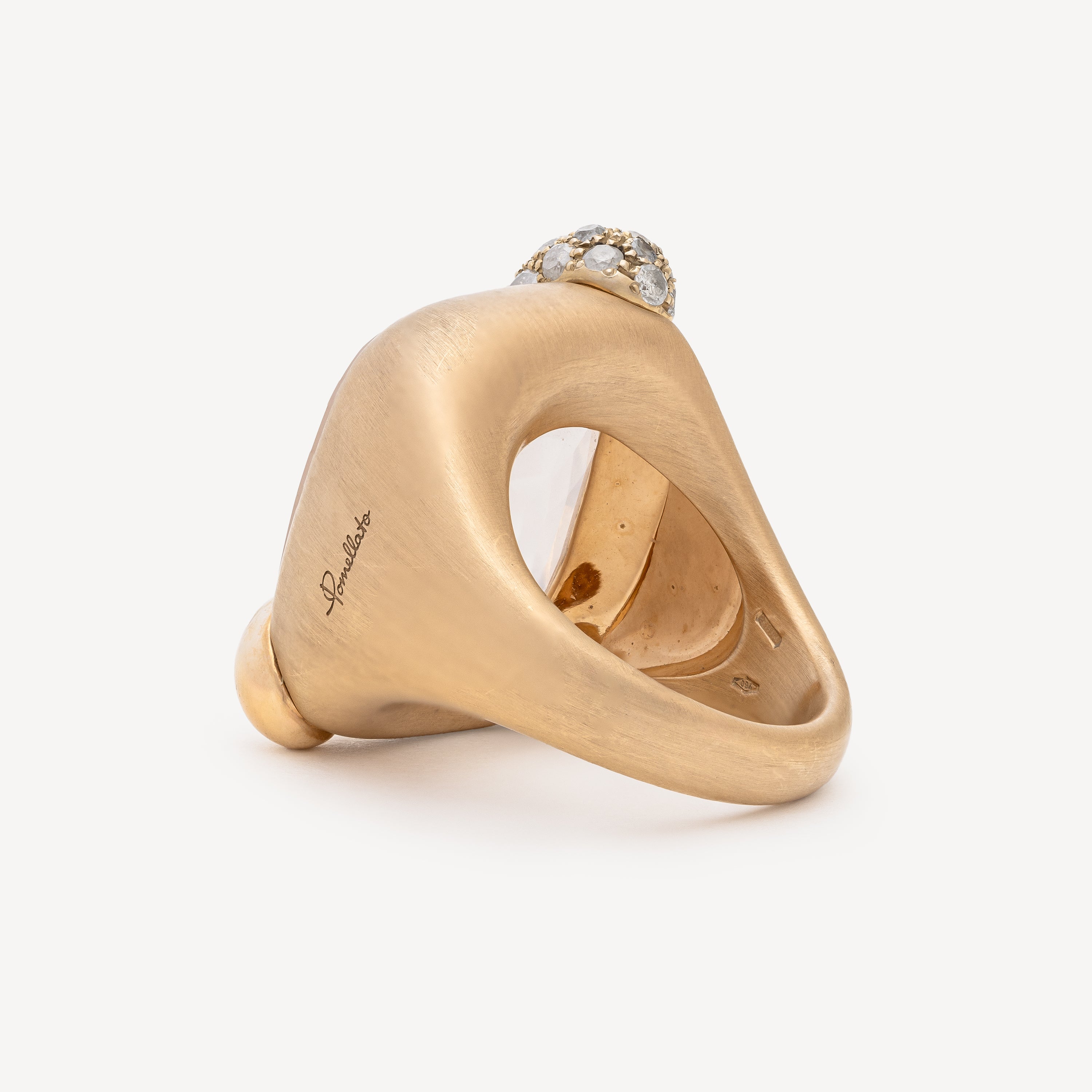 Bague medium en or jaune ornée d'un quartz icy et d'une griffe pavée de diamants.