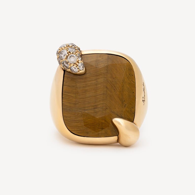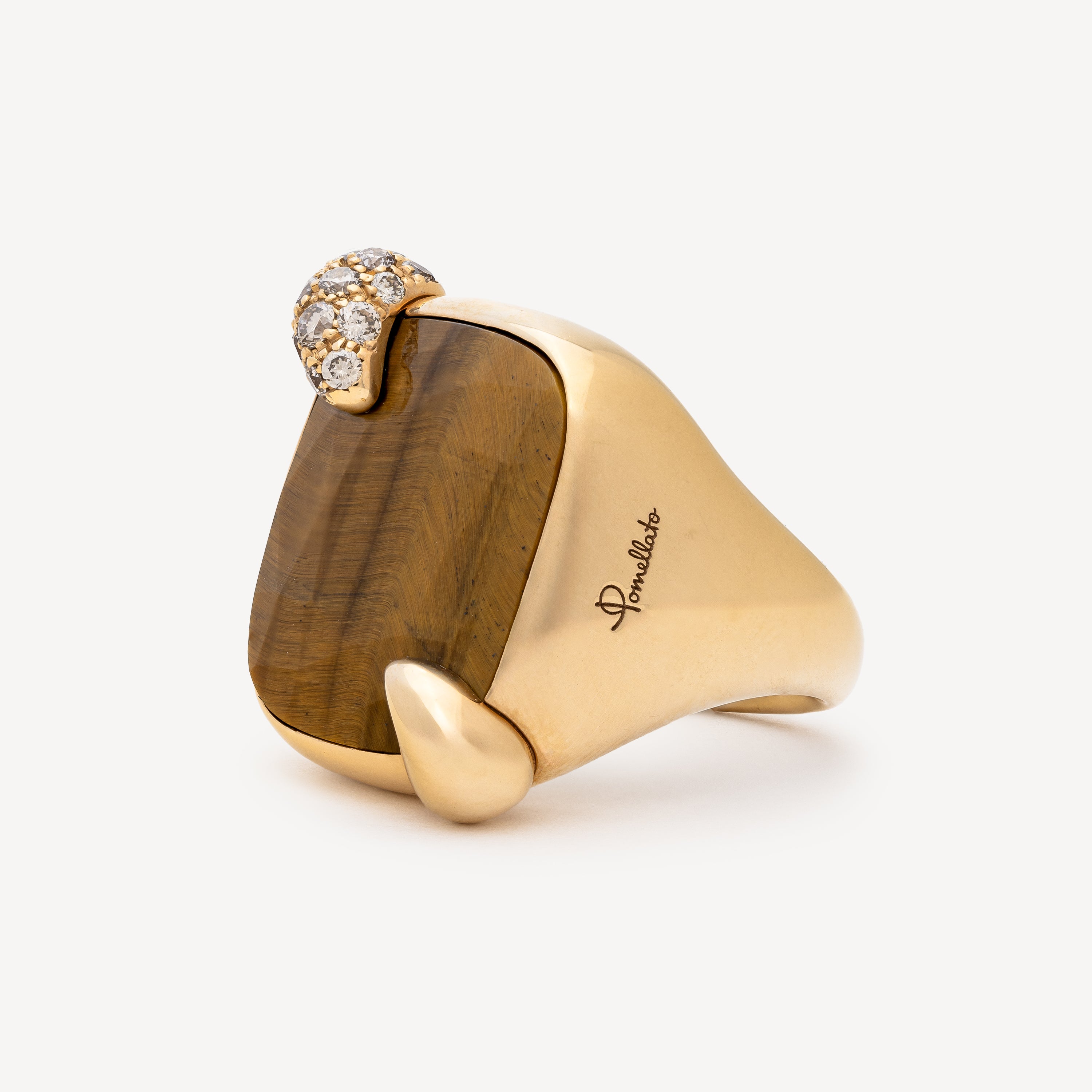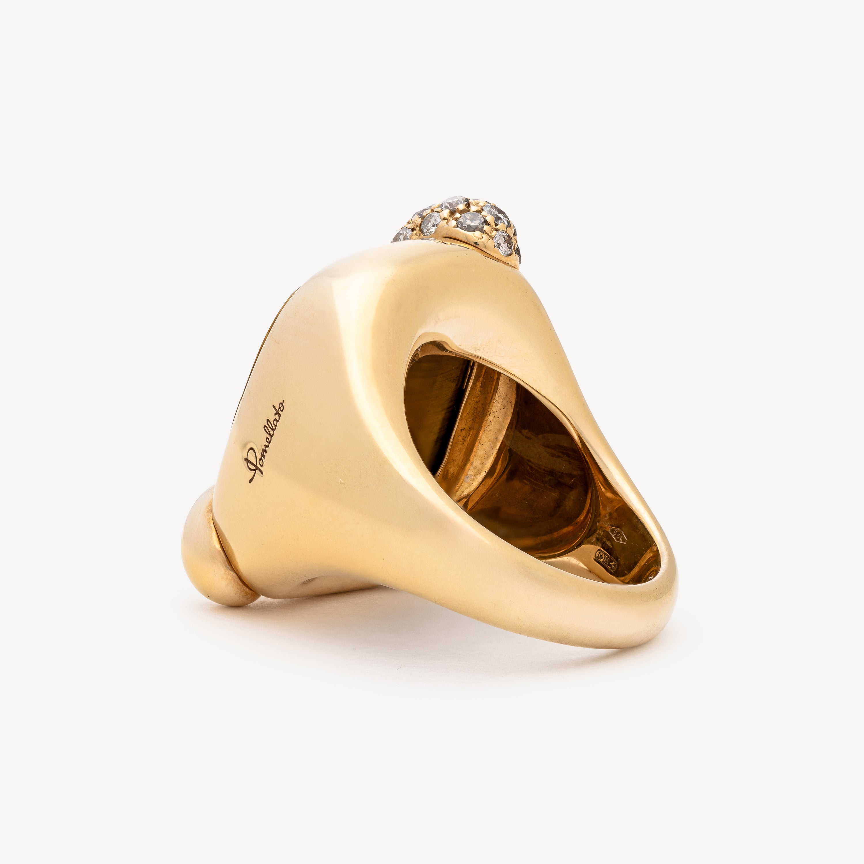 Bague medium en or jaune ornée d'un oeil de tigre central et d'une griffe pavée de diamants blancs.
