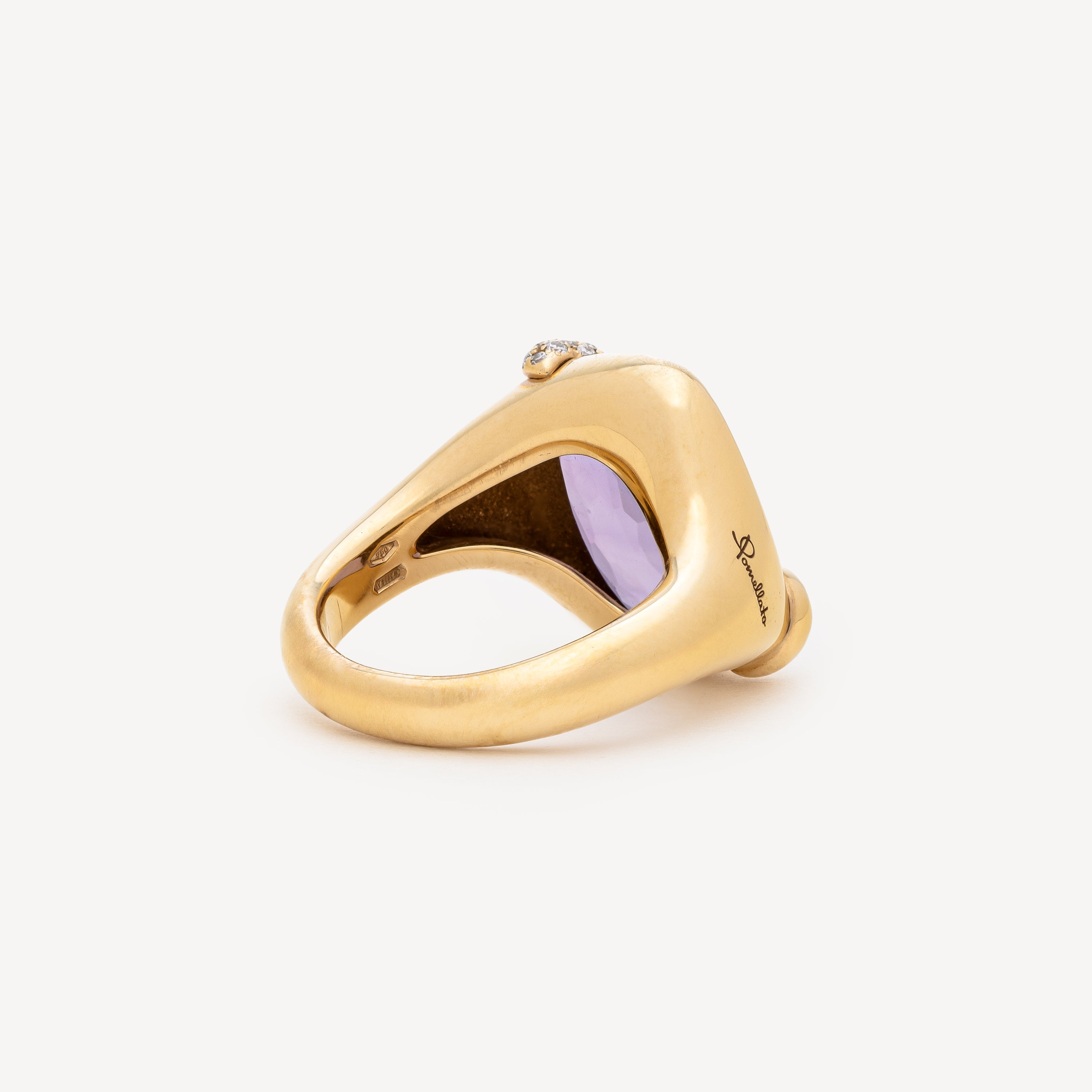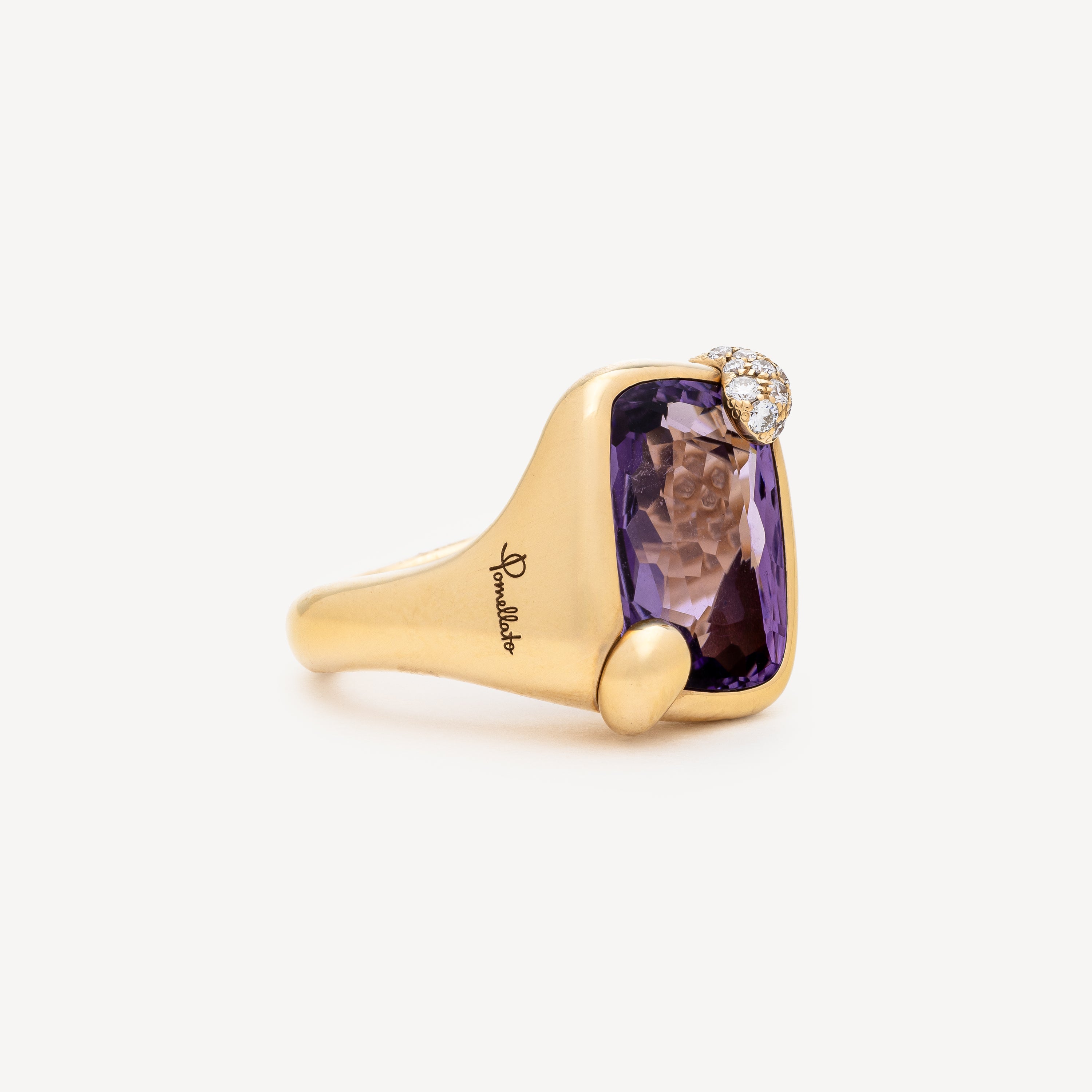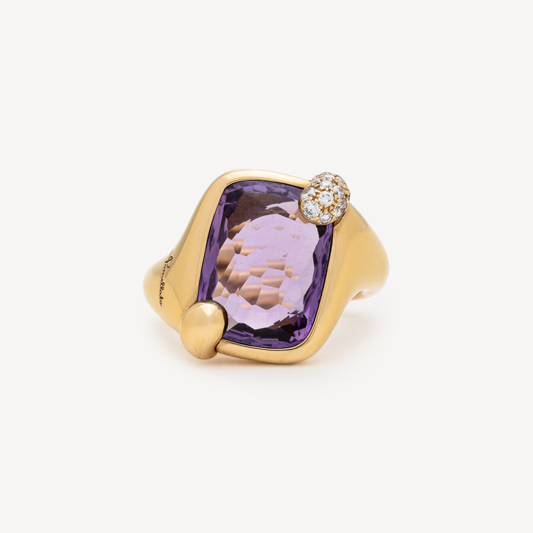 Bague mini en or jaune ornée d’une améthyste centrale et d’une griffe pavée de diamants.