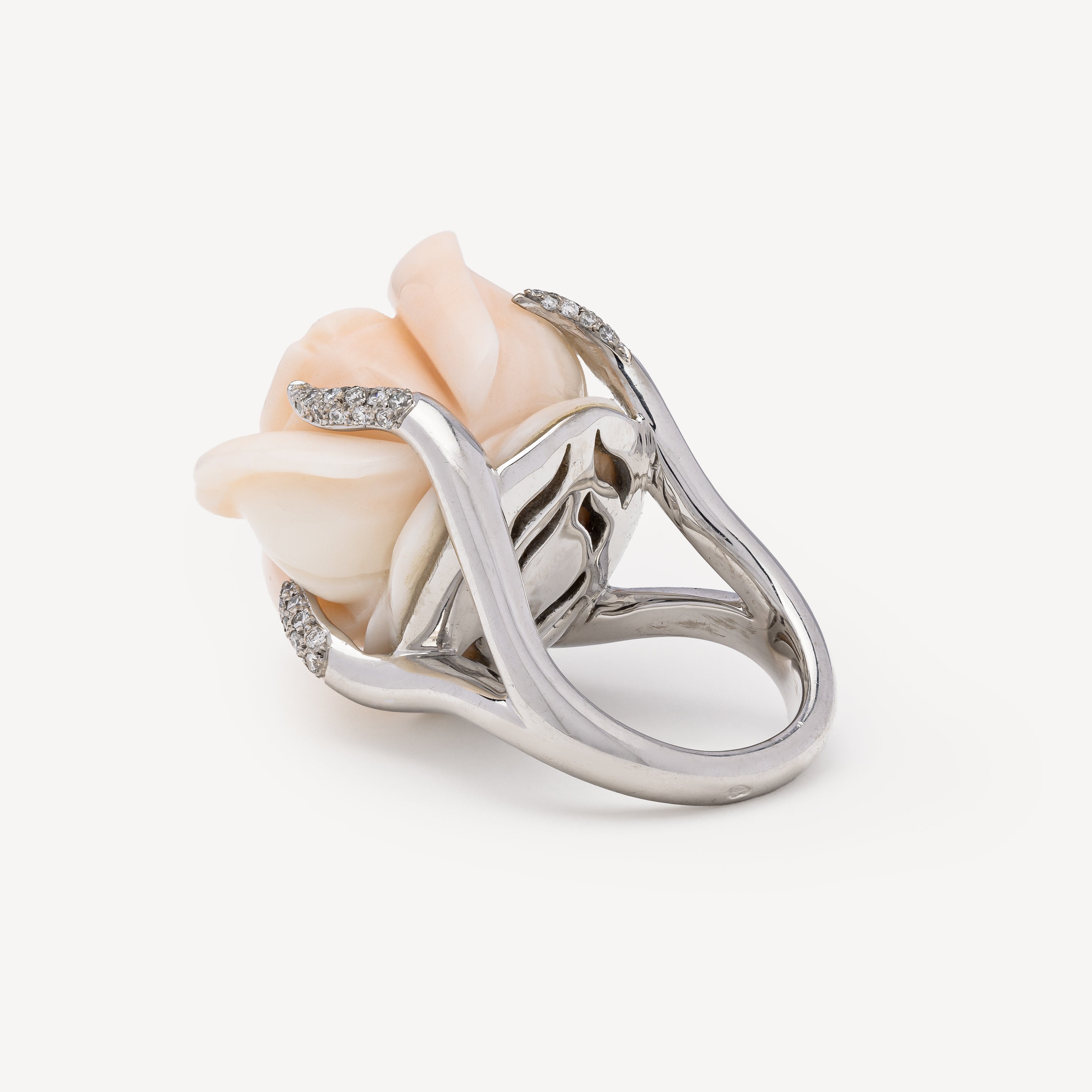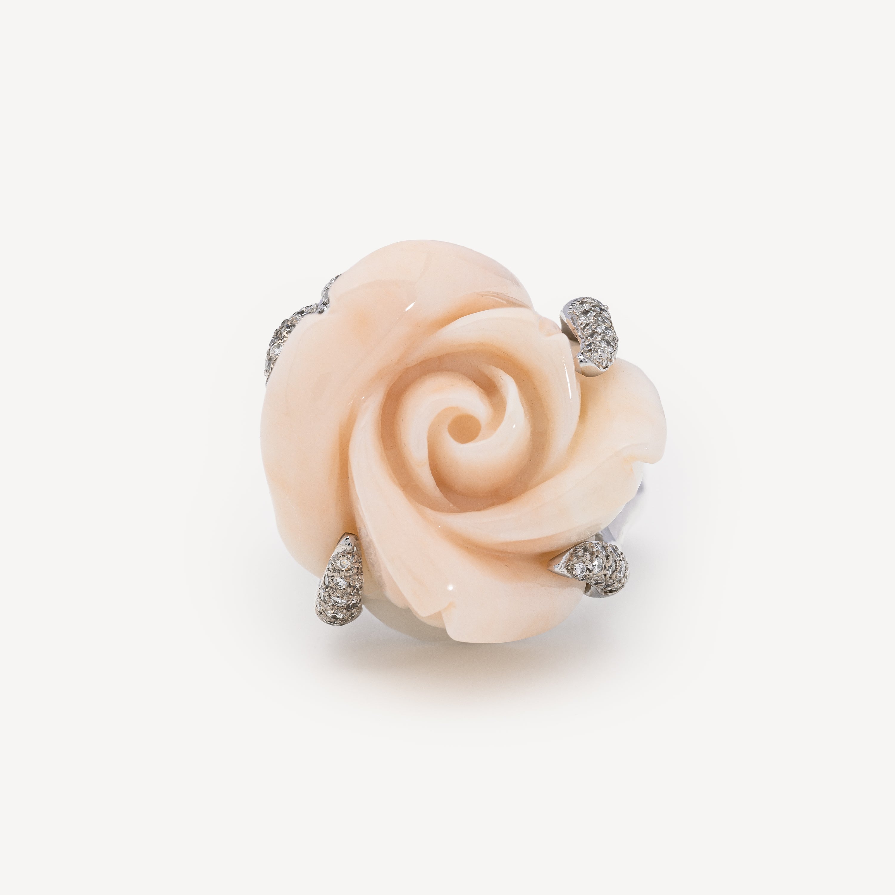 Bague rose en or blanc et corail peau d’ange, ornée de diamants blancs.
