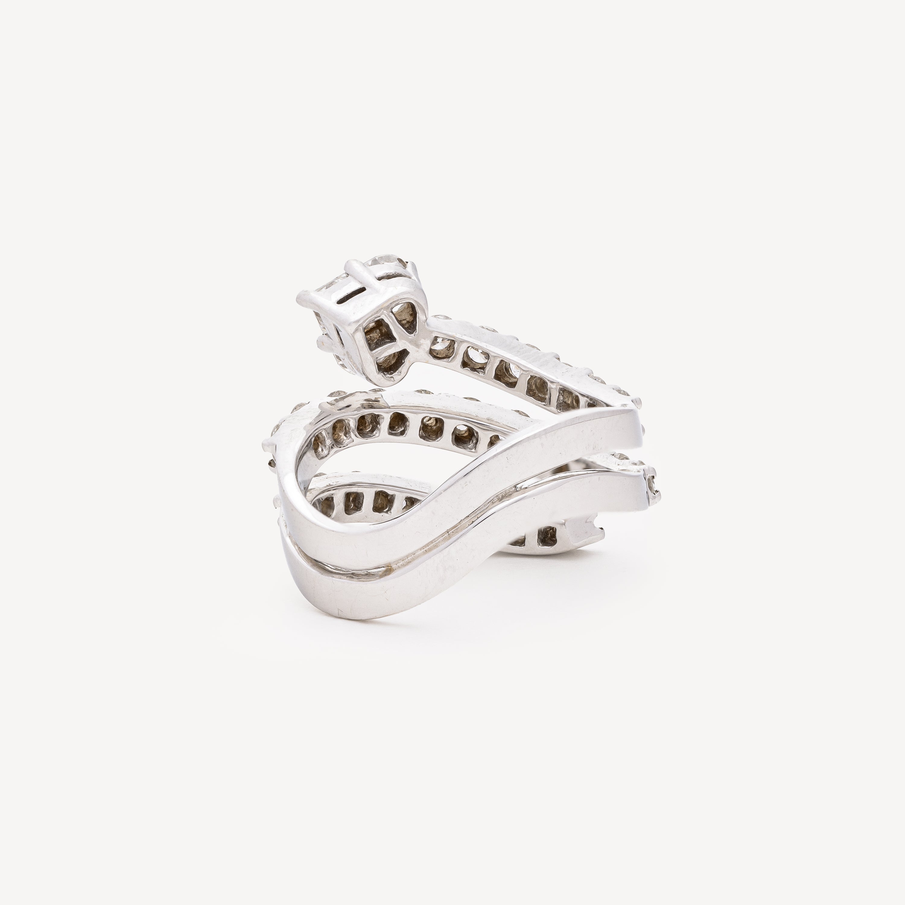 Bague en or blanc serpent à trois tours, terminée par un cœur et entièrement pavée de diamants blancs.