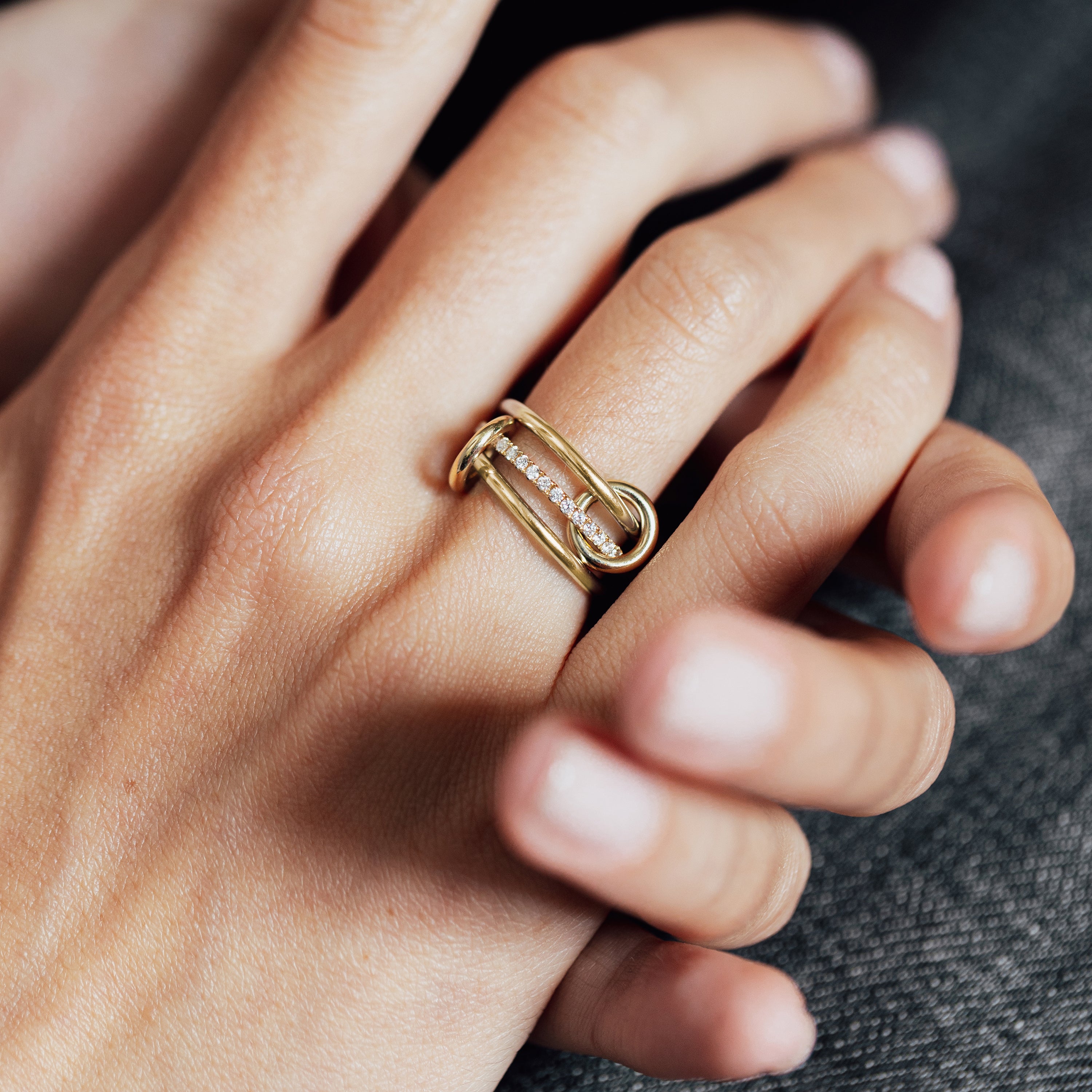La bague Sonny allie simplicité et éclat. Son anneau central pavé de diamants blancs est encadré par deux anneaux en or 18ct jaune lumineux, reliés par des connecteurs assortis. Avec ses anneaux fins de 1,7 mm, elle est idéale à empiler et parfaite pour le quotidien
