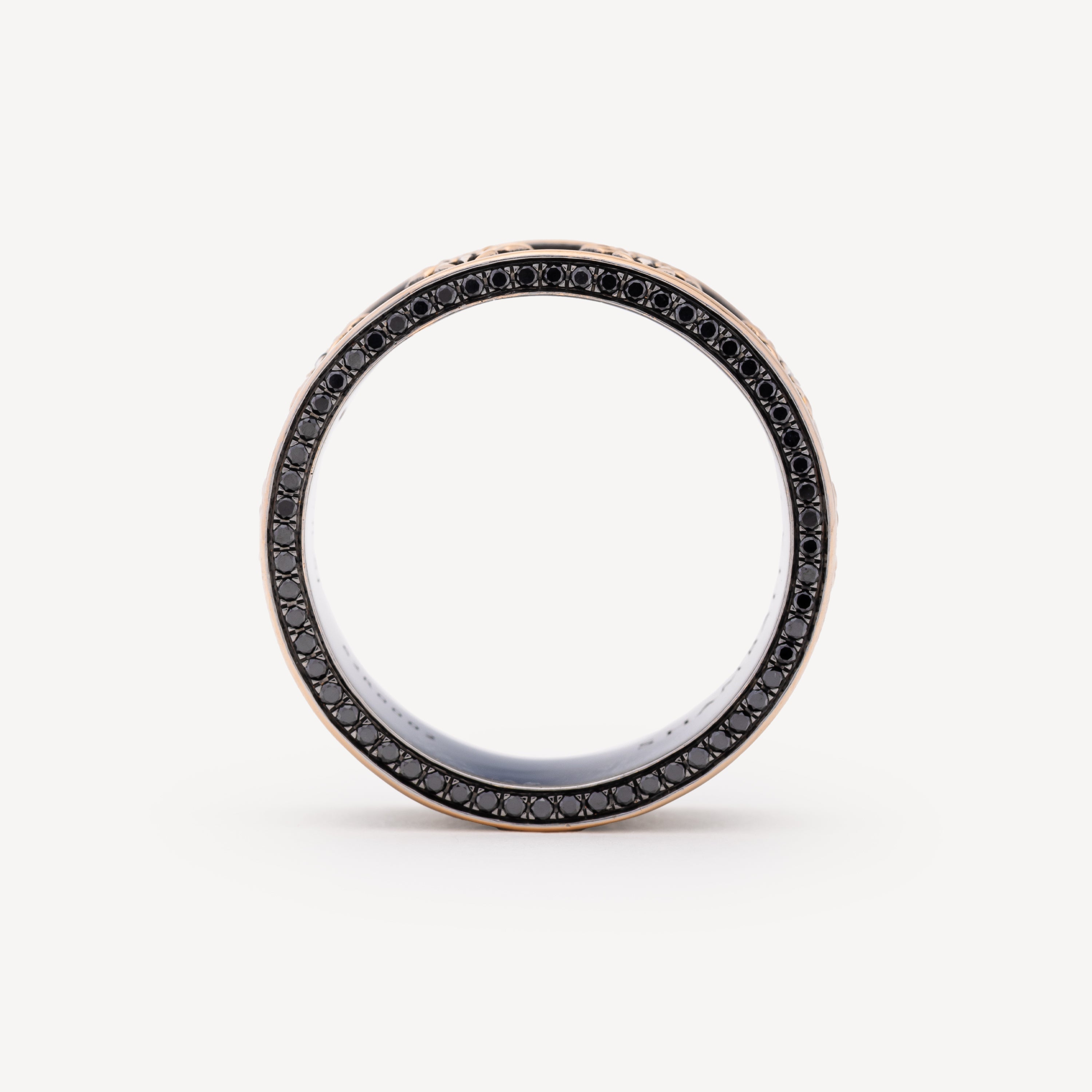 Bague en or noir et rose orné de la croix Shamballa et pavée de diamants noirs sur les deux côtés.