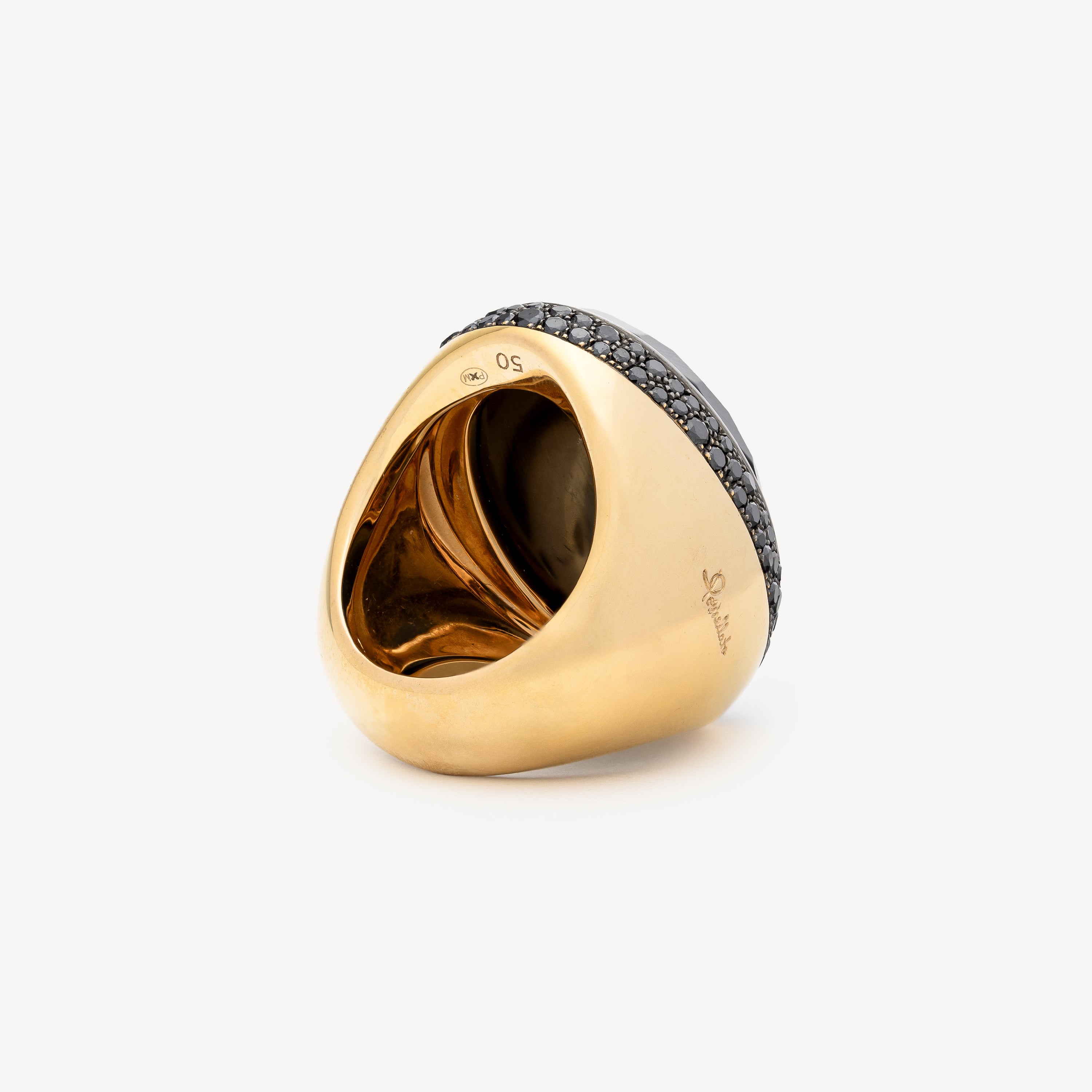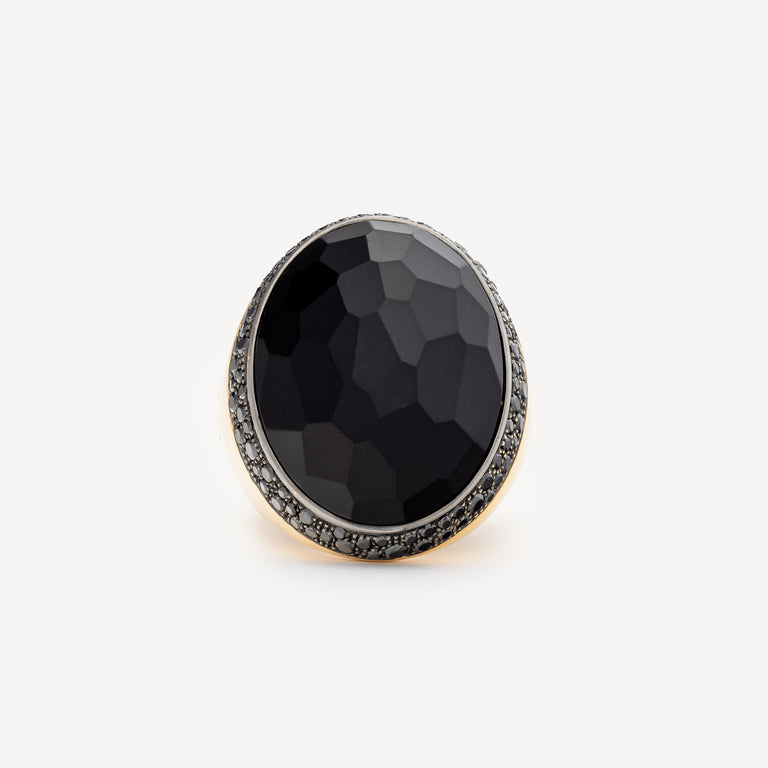 Bague en or jaune ornée d’un jais noir facetté central et entourée de diamants noirs.