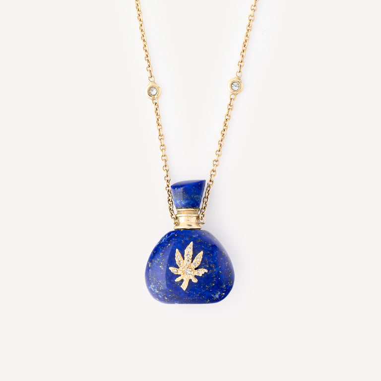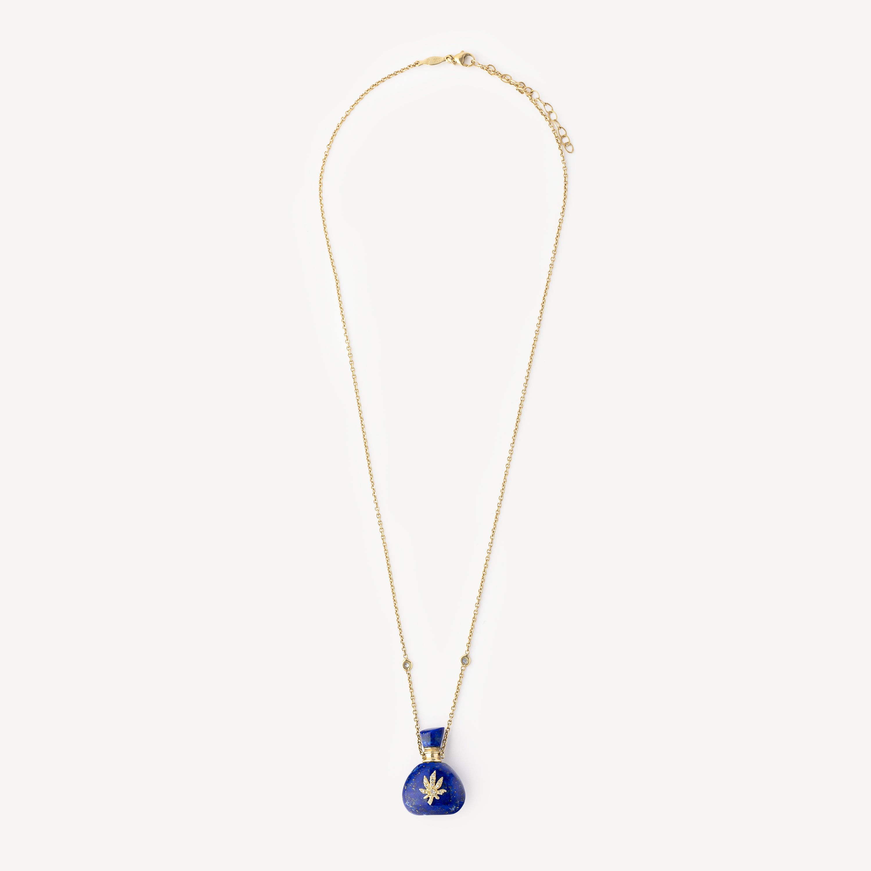 Chaîne en or jaune avec deux diamants blancs et pendentif fiole en lapis lazuli avec feuille en or et diamants.