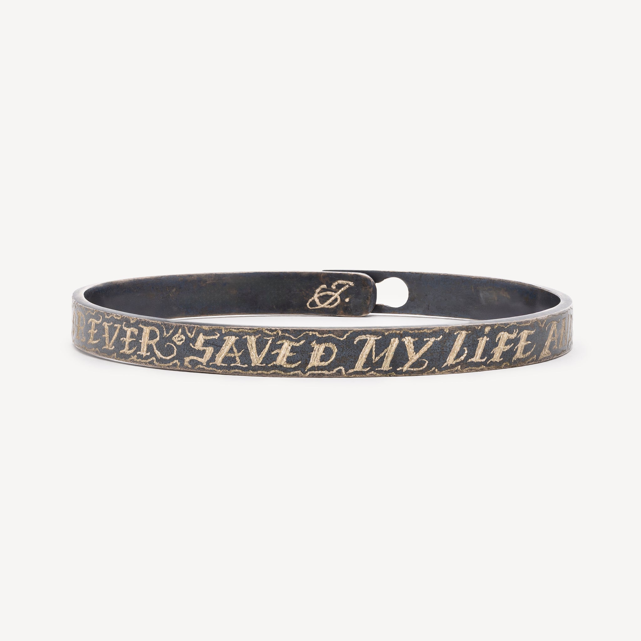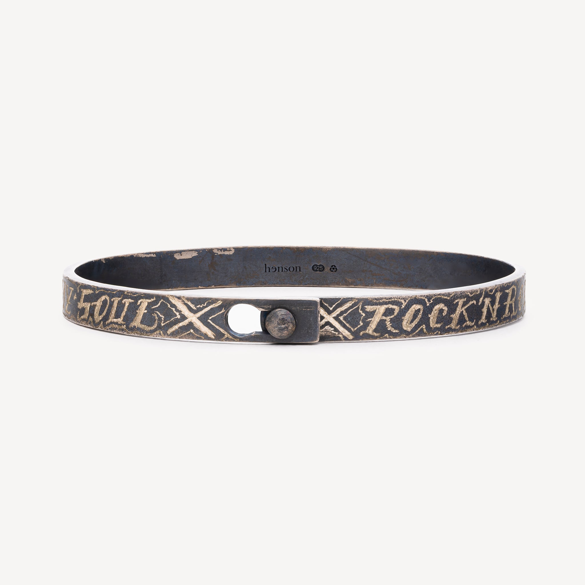Bracelet jonc en argent noirci avec inscription "Rock n roll forever saved my life and soul".