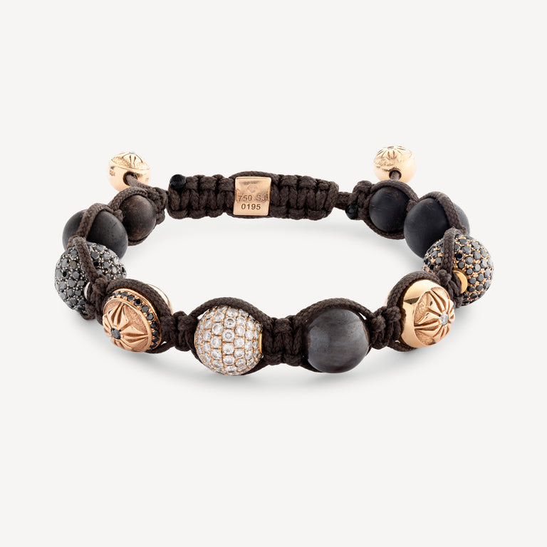 Bracelet tressé de perles en or rose ornées de diamants blancs et de diamants noirs, et de perles de saphirs gris.