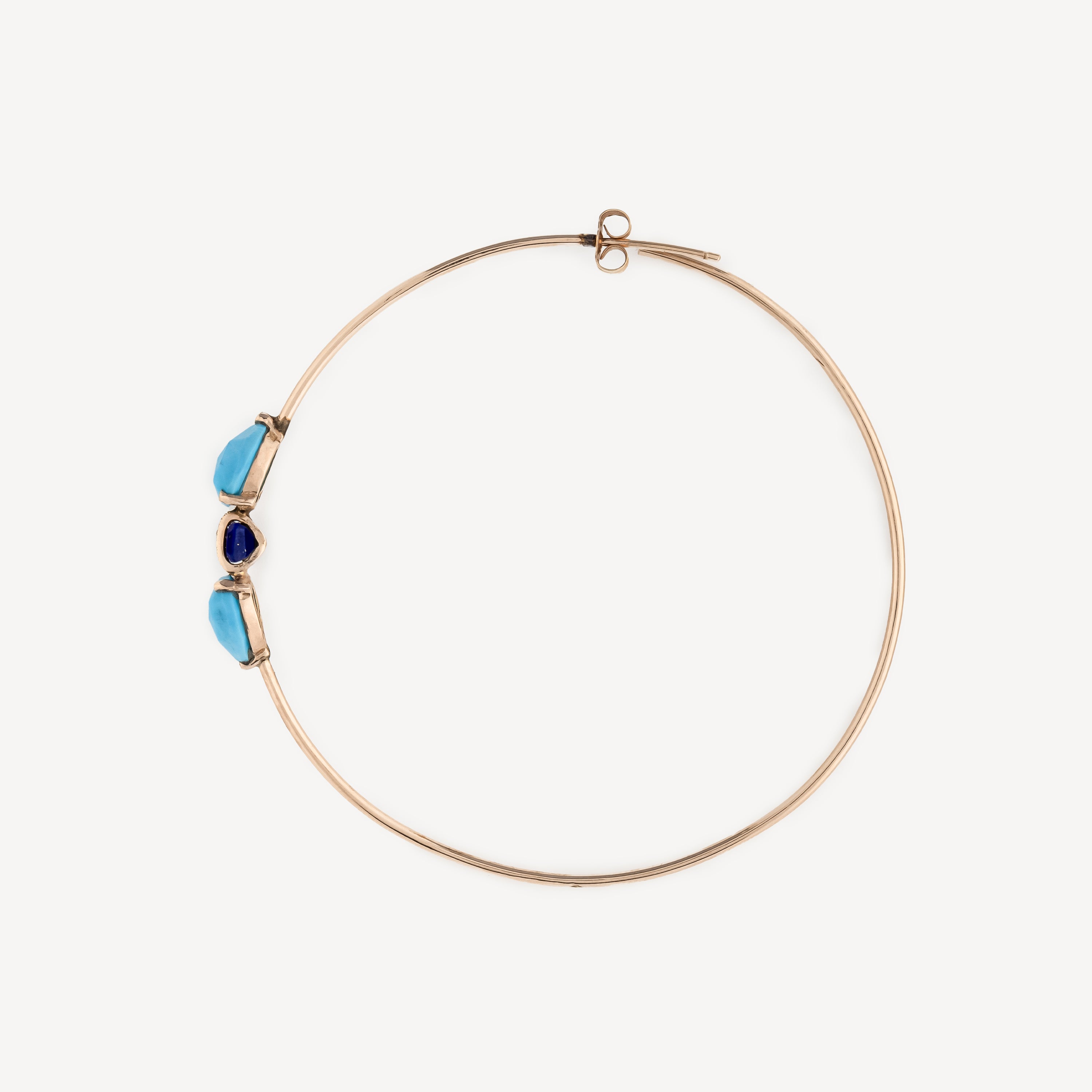 Créoles en or rose ornées de pierres lapis lazulis, magnésites et diamants blancs.