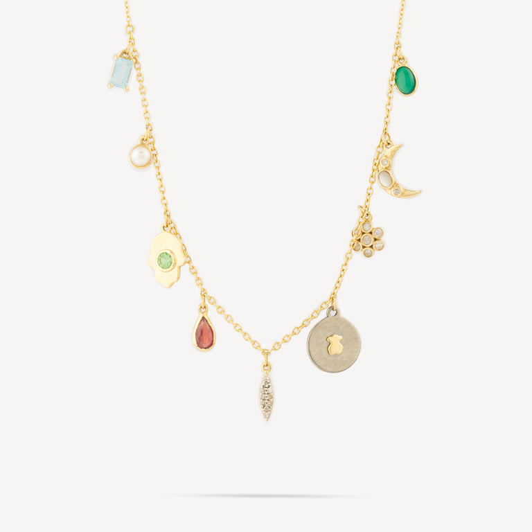 Collier en or jaune avec charms ornés de pierres précieuses et diamants