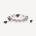 Bracelet monté sur un cordon gris composé de : une bead en or blanc sertie de diamants blancs, d’un lock en or blanc serti d’un diamant blanc, d’une bead en pierre de lune, d’une bead en perle de tahiti, d’une bead perle, de trois beads en labradorite grise, d’une bead en pierre de lune rainbow, d’une bead en corail blanc, de deux beads 8mm en saphir gris et de deux beads 8mm en pierre de lune grise.