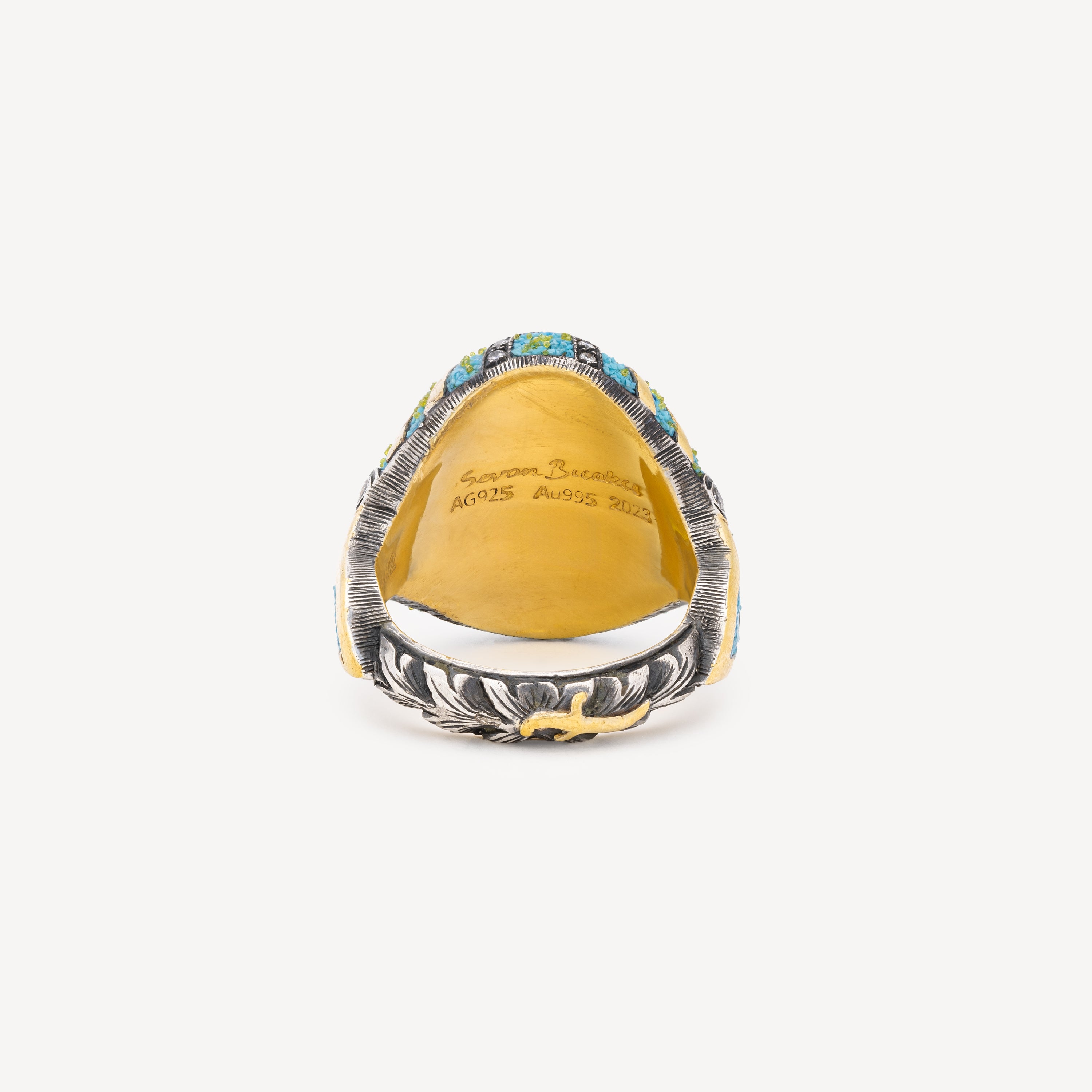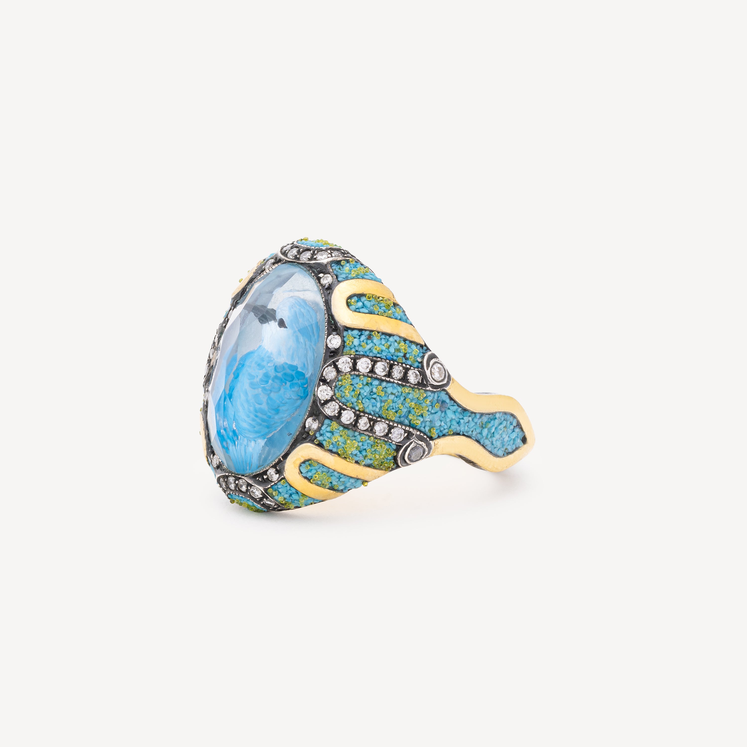 Cette bague unique en or jaune 18ct et argent met en valeur un oiseau bleu délicat, orné de diamants, turquoises et citrines. Un bijou précieux et exceptionnel qui ajoutera une touche d'élégance à votre tenue.