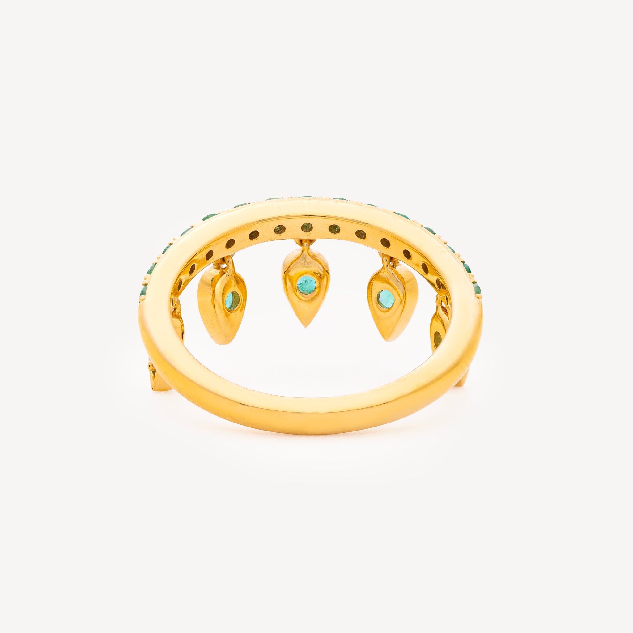 Cette bague Emerald Reverse Drop, signée Khepri, est confectionnée en or jaune et présente un anneau serti d’émeraudes. Cinq pampilles en forme de goutte, ornées chacune d’une émeraude, ajoutent une touche de délicatesse. L’émeraude est une pierre d’harmonie et de renouveau, réputée pour apaiser les émotions.