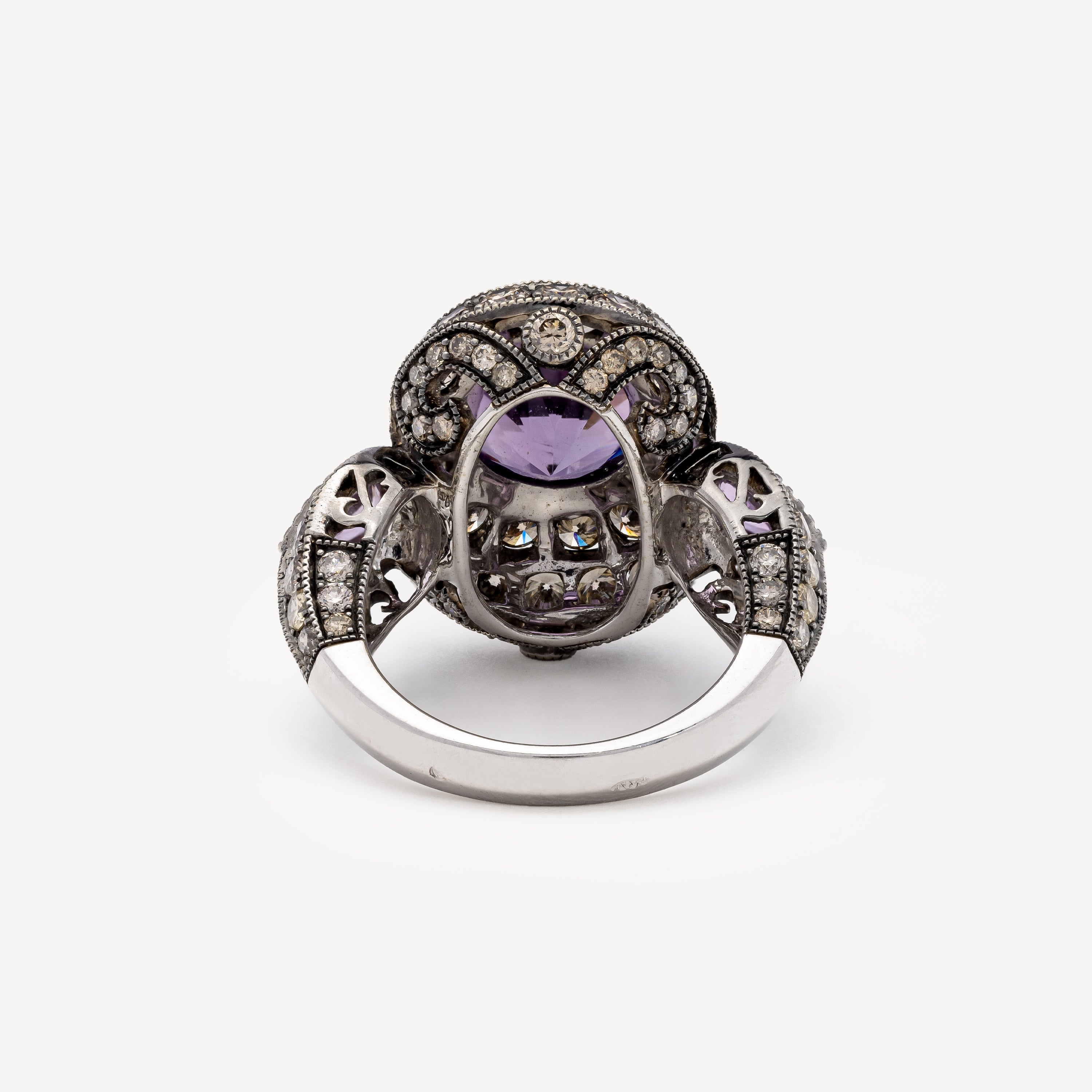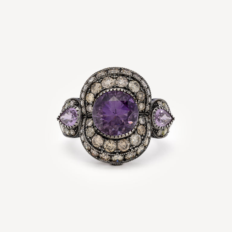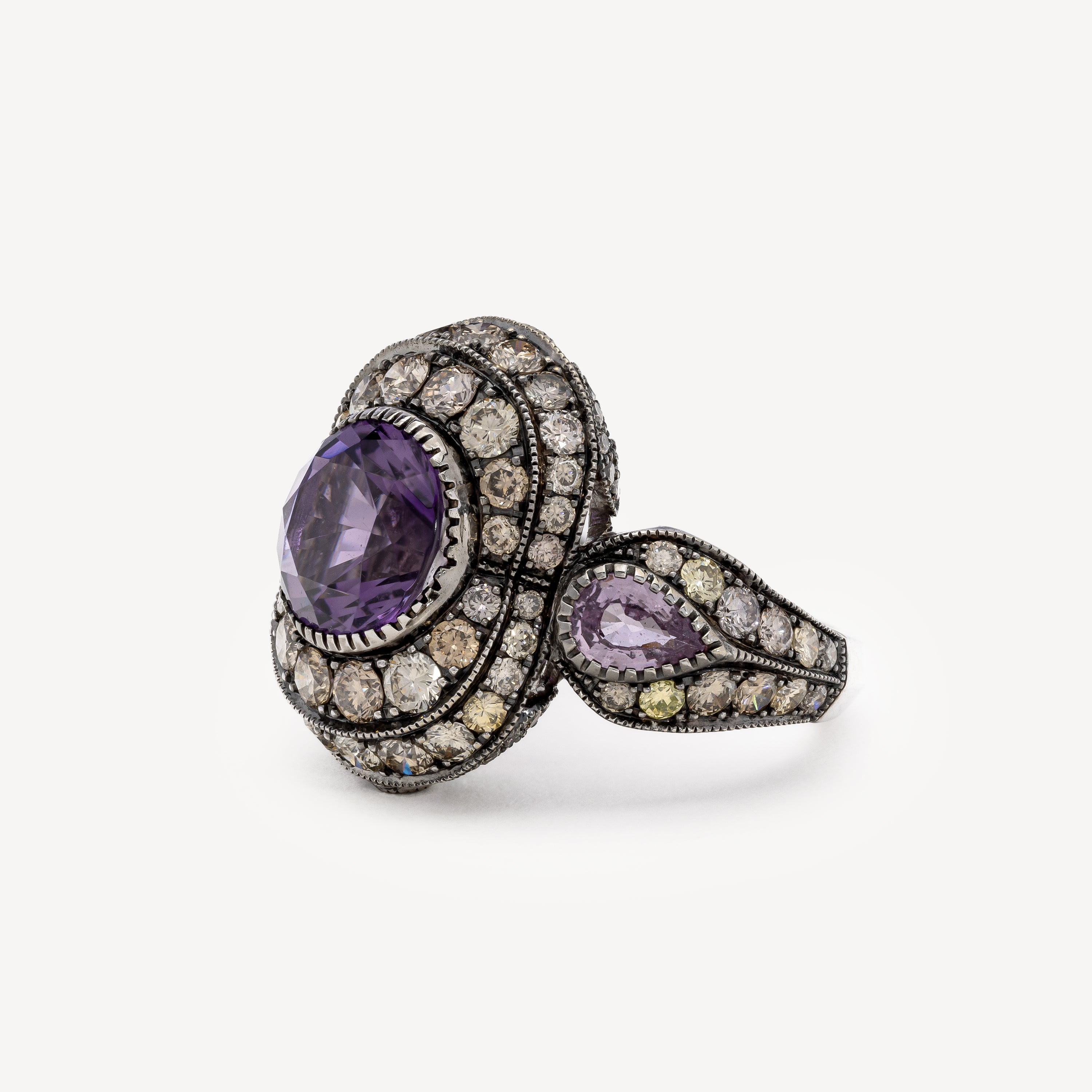 Bague en or blanc sertie de diamants dégradés beiges rosés, de deux saphirs roses et d’une améthyste centrale.